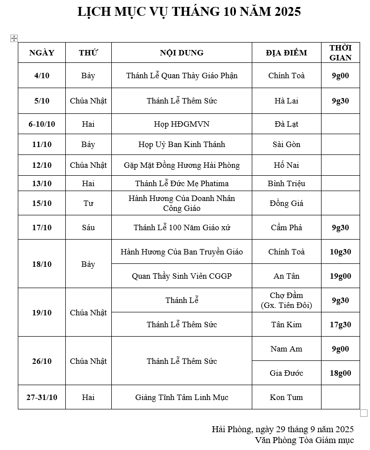 Trong tinh thần hiệp thông, TGM xin trân trọng gửi đến Quý độc giả lịch mục vụ của Đức Giám mục Giáo phận trong tháng 10 năm 2025 (cập nhật ngày 30/9)