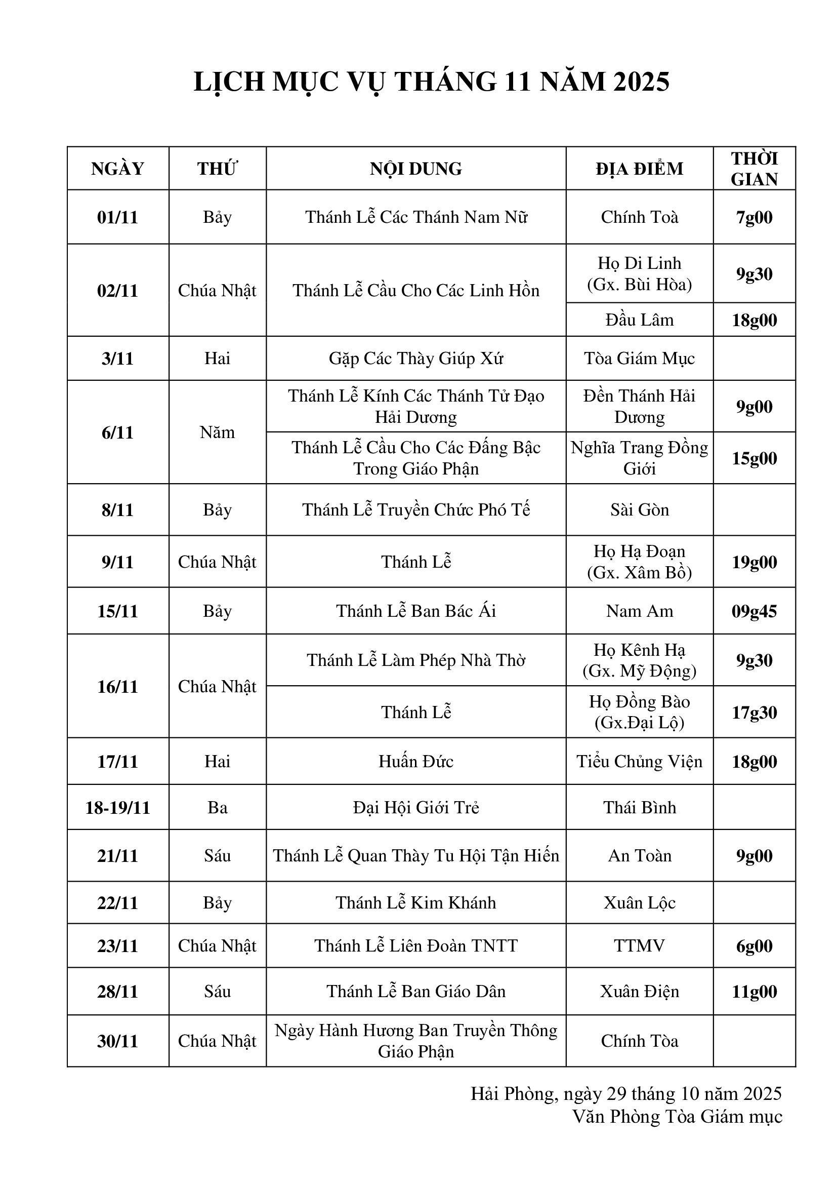 Trong tinh thần hiệp thông, TGM xin trân trọng gửi đến quý độc giả lịch mục vụ của Đức Giám mục Giáo phận trong tháng 11 năm 2025