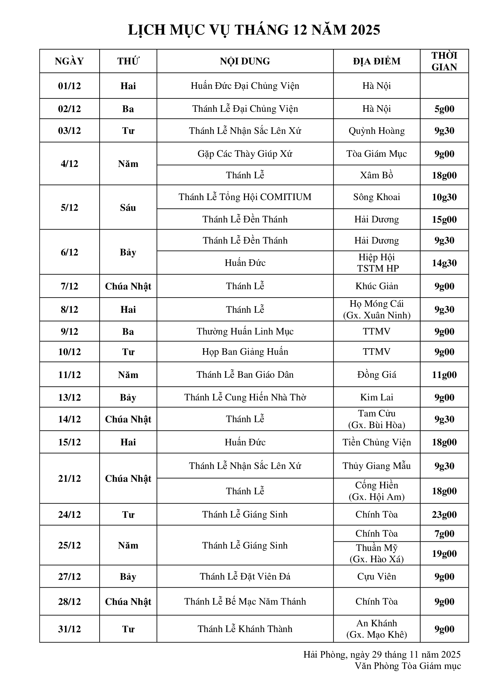 Trong tinh thần hiệp thông, Tòa Giám mục xin trân trọng gửi đến quý độc giả lịch mục vụ của Đức Giám mục Giáo phận trong tháng 12 năm 2025