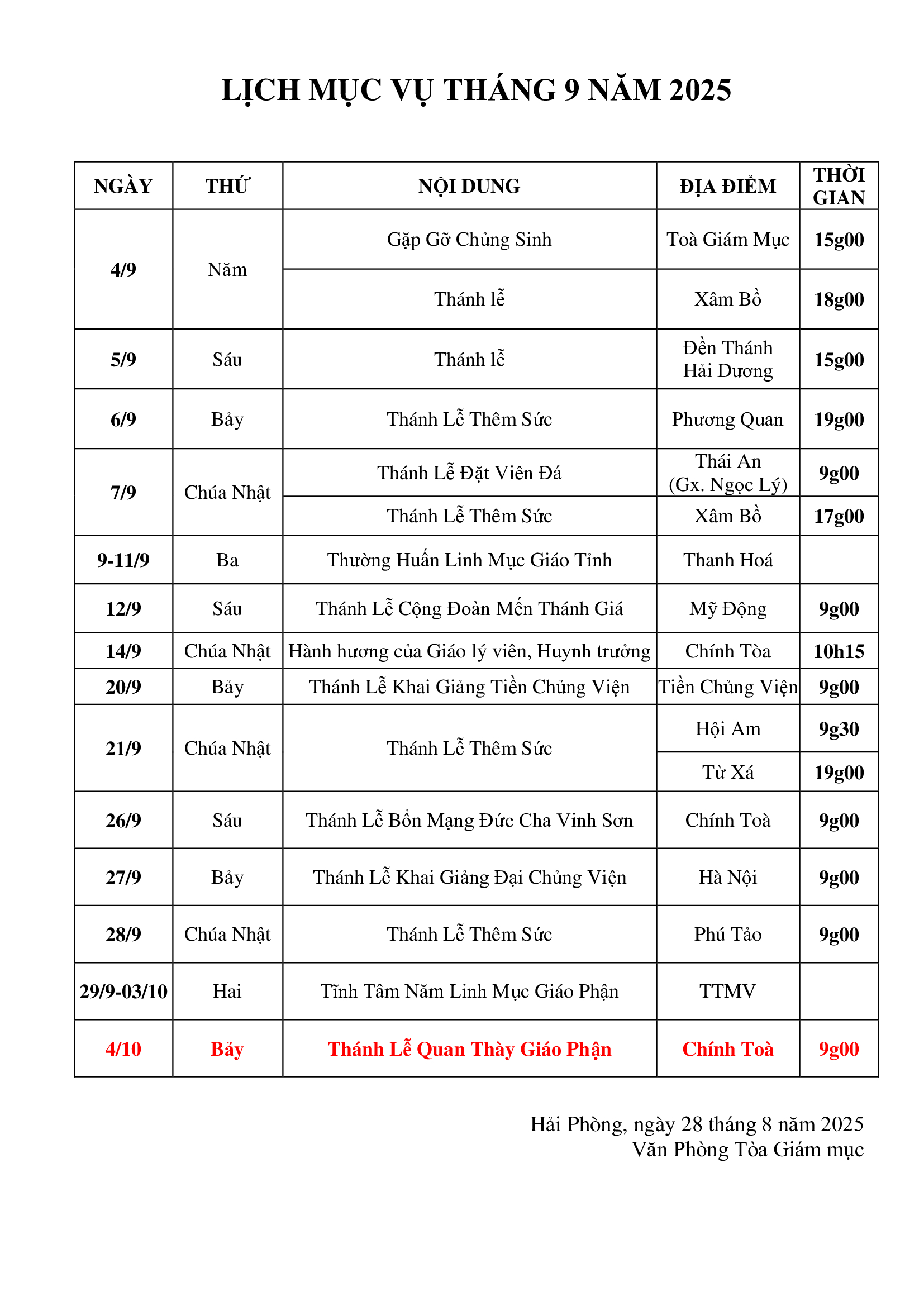 Trong tinh thần hiệp thông, TGM xin trân trọng gửi đến Quý độc giả lịch mục vụ của Đức Giám mục Giáo phận trong tháng 9 năm 2025.
