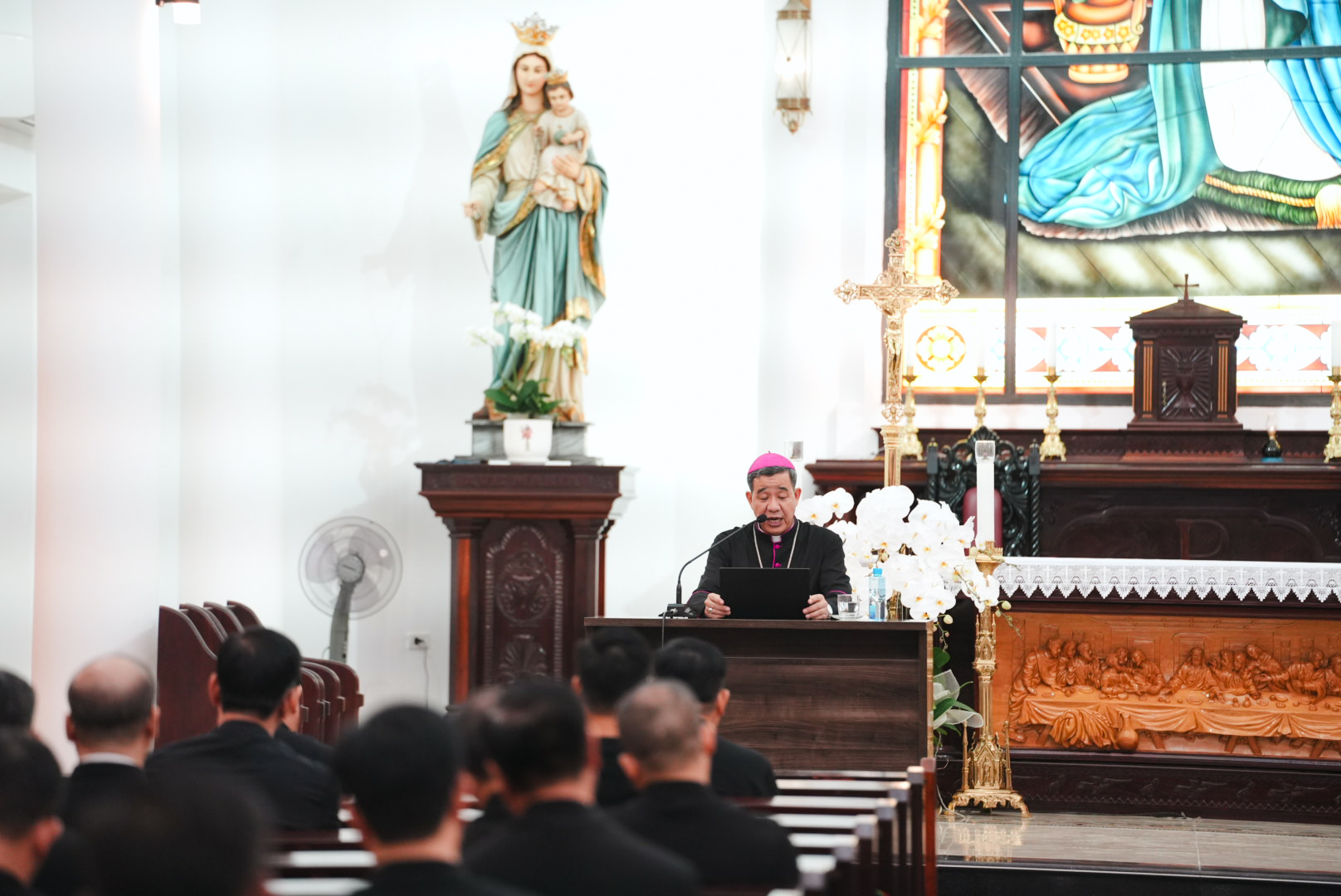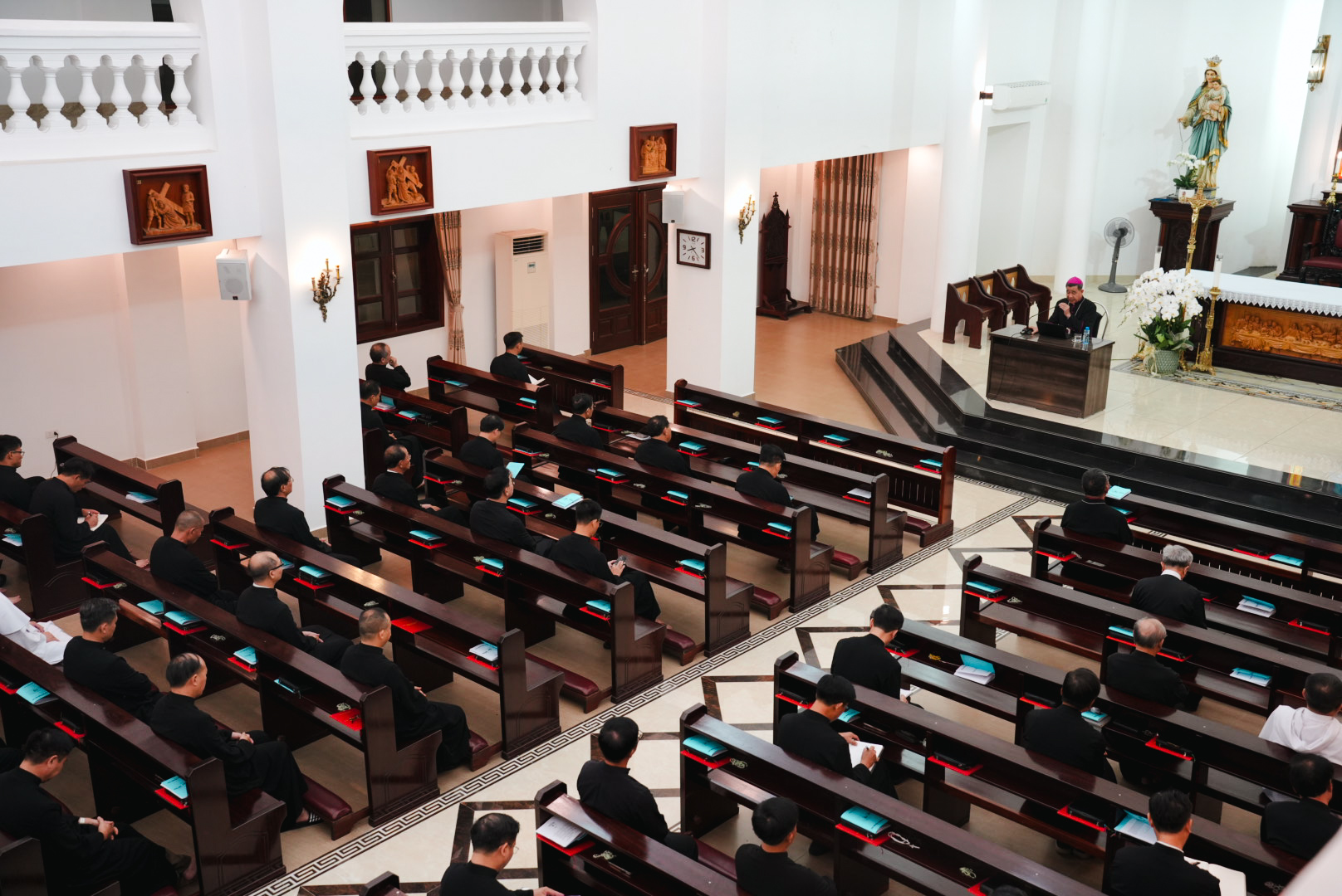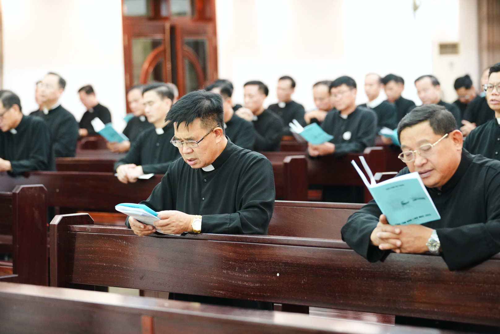 Ngay sau giờ Chầu Thánh Thể, Đức Cha Đaminh đã khai mở chủ đề đầu tiên của kỳ tĩnh tâm. Ngài nhấn mạnh: “Cầu nguyện là hơi thở của đời sống đức tin, và là yếu tố sống còn trong đời sống linh mục.” Những lời chia sẻ sâu sắc và đầy tâm huyết ấy đã đánh động tâm hồn, khơi dậy nơi các cha niềm xác tín và niềm vui của đời dâng hiến, giúp quý Cha sẵn sàng bước vào tuần tĩnh tâm với tâm hồn rộng mở và lòng khao khát được ở lại bên Chúa.