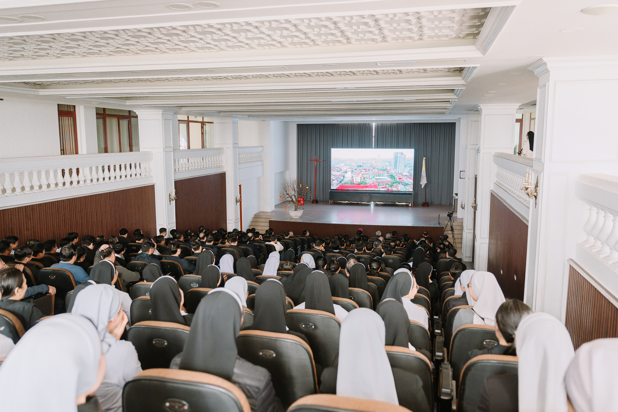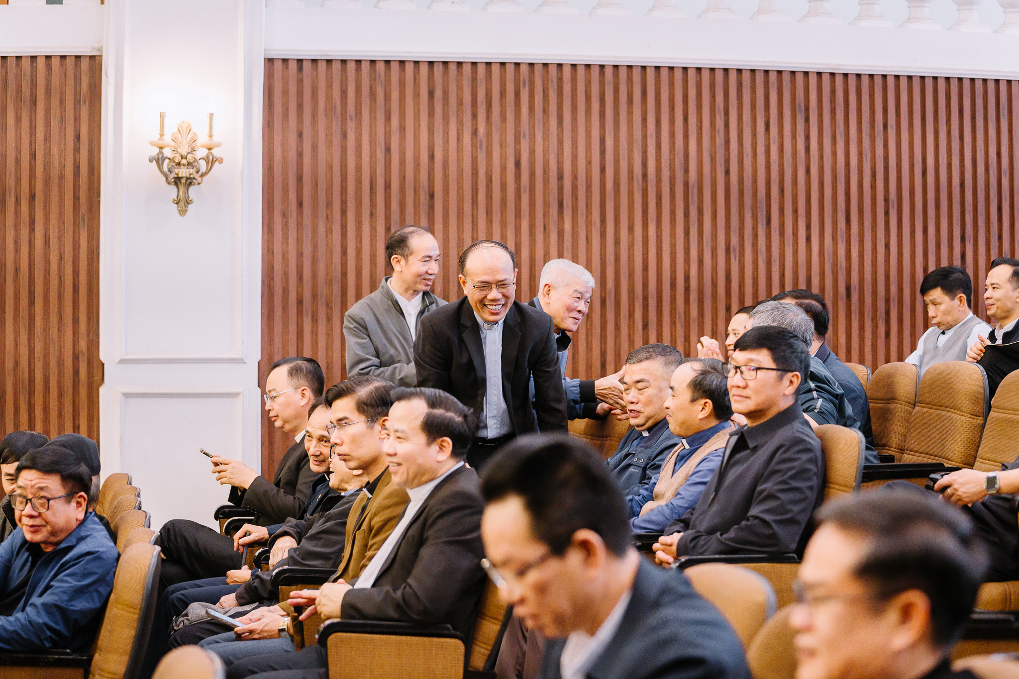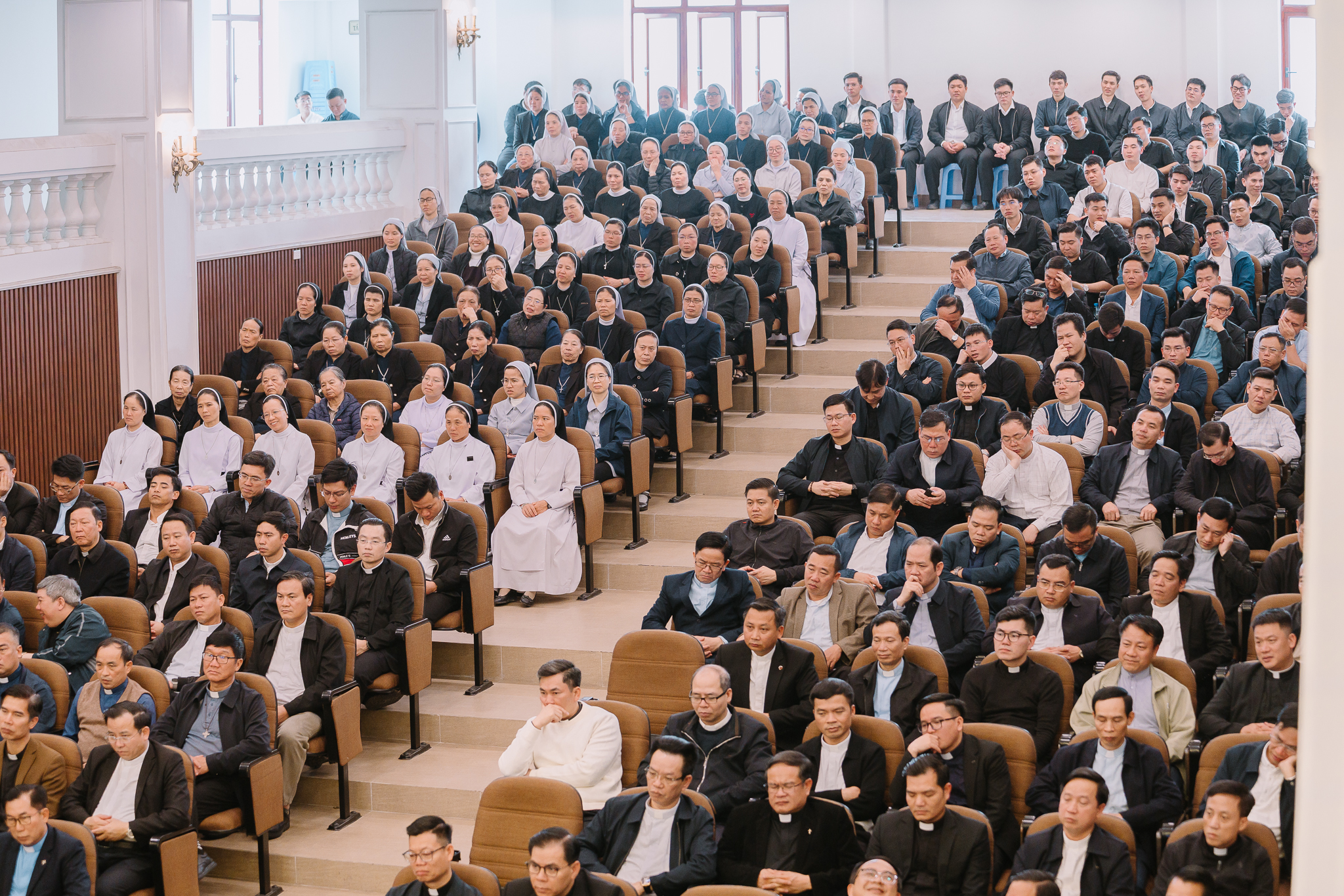 Tại hội trường, mọi người gặp lại nhau sau thời gian phục vụ tại các giáo xứ. Những cuộc trò chuyện ngắn, những nụ cười thân quen và những cái bắt tay nối tiếp nhau, thể hiện sự gắn bó và tinh thần huynh đệ trong đời sống thánh hiến.