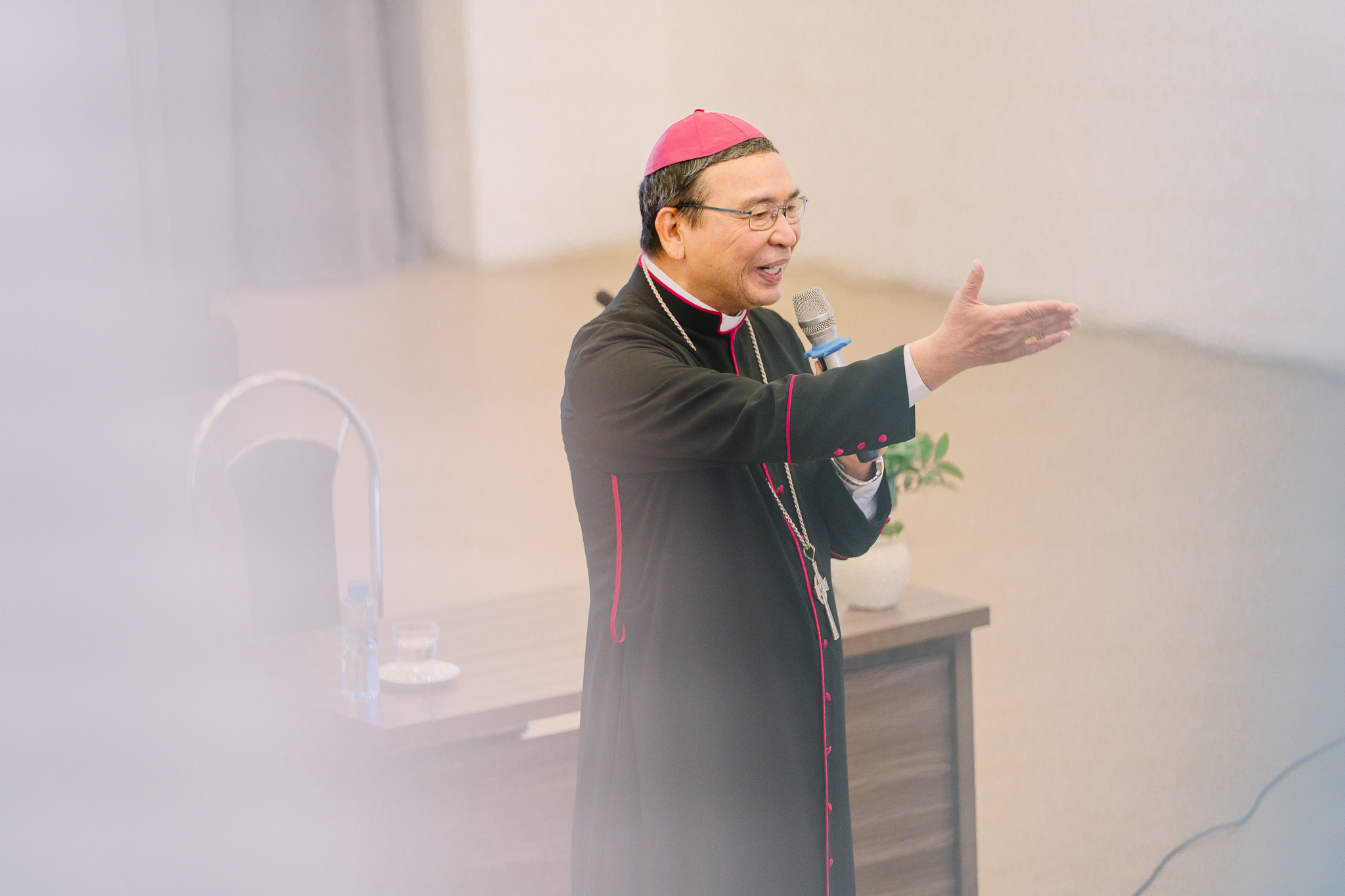 Trước sảnh Trung tâm Mục vụ, Đức cha Vinhsơn ân cần chào đón và thăm hỏi các linh mục, chủng sinh và tu sĩ khi các đoàn lần lượt tiến vào khu vực sinh hoạt chung.