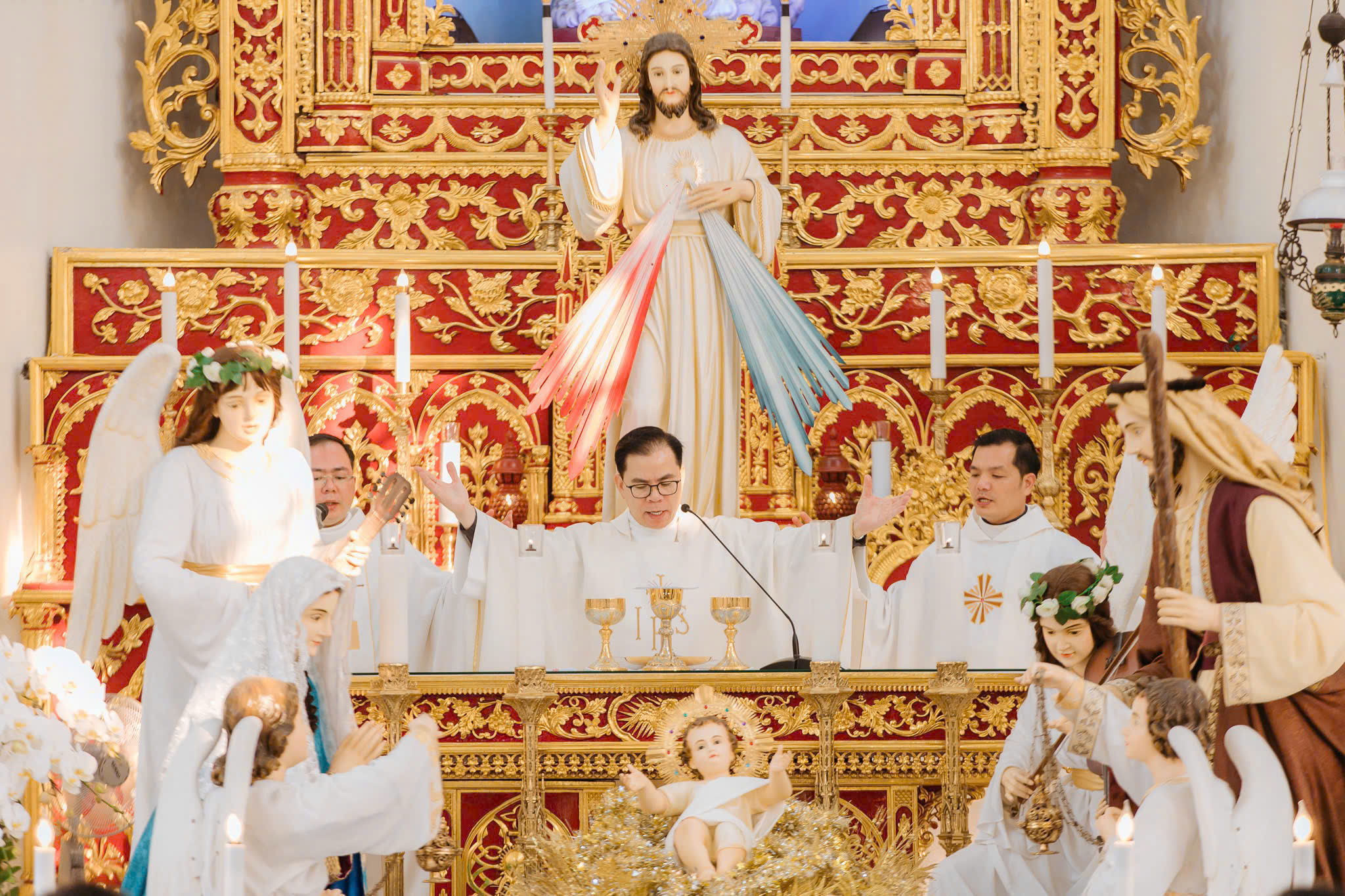 Buổi chiều, cộng đoàn cùng hiệp thông trong giờ cầu nguyện kính Lòng Chúa Thương Xót cách sốt sắng, và đặc biệt là Thánh Lễ tôn vinh Lòng Chúa Thương Xót do cha Phaolô Vũ Đình Viết chủ tế. Trong bài giảng, cha Giuse tiếp tục dẫn dắt cộng đoàn chiêm ngắm Mầu nhiệm Nhập Thể cao cả: Hài Nhi Giêsu chính là Ngôi Lời nhờ đó muôn vật được tạo thành, là Ánh Sáng thật chiếu soi trần gian và là nguồn suối mọi sự lành.