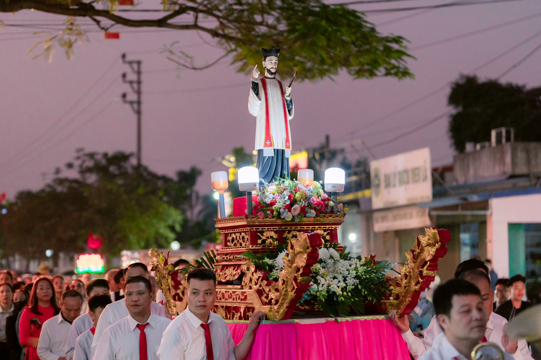 Chiều tối thứ Ba ngày 02/12, làng Quỳnh Hoàng chìm trong không khí của ngày lễ hội khi đoàn rước kiệu Thánh Phanxicô Xaviê cung nghinh quanh làng, mở đầu cho Thánh lễ tri ân tổ tiên do Cha xứ Giuse Vũ Văn Khương chủ tế. Cùng đồng tế với Cha xứ Giuse có Cha cựu quản nhiệm Phaolô Vũ Đình Viết, Cha đặc trách xứ Lập Lễ Phêrô Nguyễn Văn Diện.