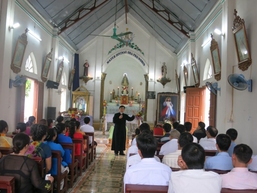 Sau lời chào hỏi thân tình, cha Gioan Baotixita Nguyễn Quang Sách đã gặp gỡ và chia sẻ cộng đoàn nơi đây. Xuất phát từ nguồn gốc mỗi người mỗi nơi (Hải Phòng, Hải Dương, Thái Bình, Ninh Bình . . .), nhưng quy tụ nhau trong một cộng đoàn Đức tin, cha Gioan đã nêu lên nét đẹp của tình gia đình giữa những người tín hữu. Dù khác nhau về nguồn gốc, tính cách, hoàn cảnh . . ., nhưng trong Đức Kitô, tất cả đều là anh em con một nhà, cùng một gia đình đức tin và tôn thờ cùng một Chúa. Cha Gioan Baotixita cũng mời gọi cộng đoàn khám phá Lòng xót thương của Chúa dành cho nhân loại qua chính hình ảnh trái tim bị đâm thâu khiến máu và nước tuôn trào, qua những con người được ánh mắt xót thương nhìn tới, khiến họ hối cải và đổi mới cuộc đời như Dakeu, Mátthêu, Phêrô . . . Khi đã cảm nhận được lòng xót thương của Chúa, cha mời gọi người tín hữu Tiên Yên hãy “biết sống xót thương nhau như lời chỉ dạy của Đức Thánh Cha Phanxicô trong Năm thánh này – Thương xót như Chúa Cha”.