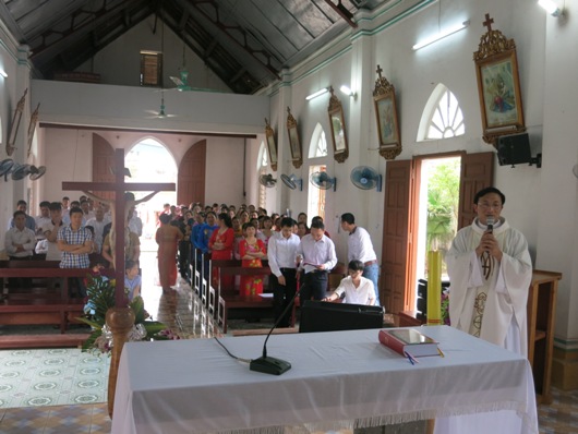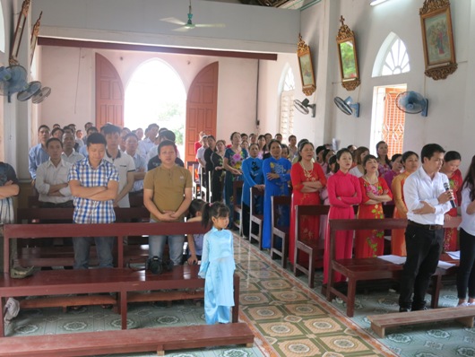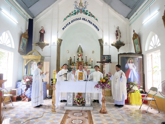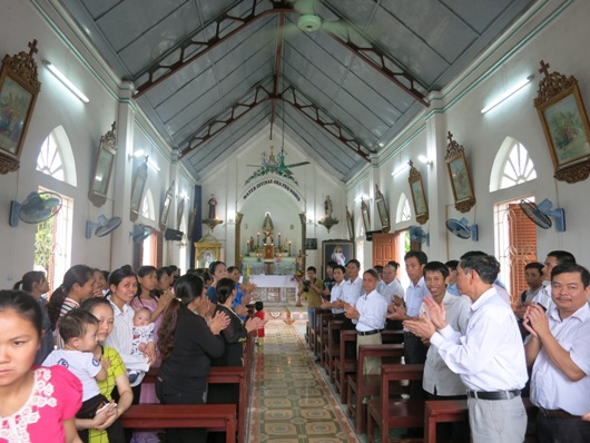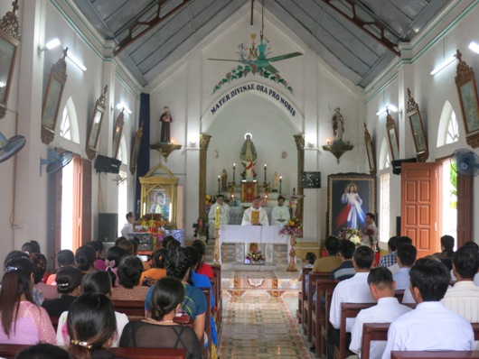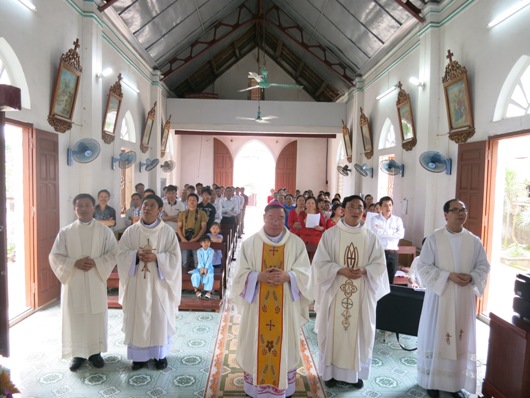 Tiếp theo giờ chia sẻ là thánh lễ tạ ơn và cầu nguyện cho cộng đoàn nơi đây. Khởi đầu thánh lễ, cha xứ Augustinô đã trịnh trọng giới thiệu Đức cha và quý cha với cộng đoàn. Ông trùm cả đã thay lời cộng đoàn bày tỏ niềm vui sướng hân hoan được đón Đức cha và quý cha đến viếng thăm. Những bông hoa tươi thắm, thay cho những lời không thể nói hết, được kính dâng lên người cha chung của Giáo phận trong niềm yêu mến và tri ân. Đáp lại, Đức cha bày tỏ lời cảm ơn về sự đón tiếp của cha xứ và cộng đoàn dành cho ngài cũng như phái đoàn. Ngài vui sướng nói lên những sự thay đổi của giáo họ nhỏ bé nơi đây, một giáo họ “tuy nhỏ bé, nhưng trẻ trung, sinh động và có tương lai”.