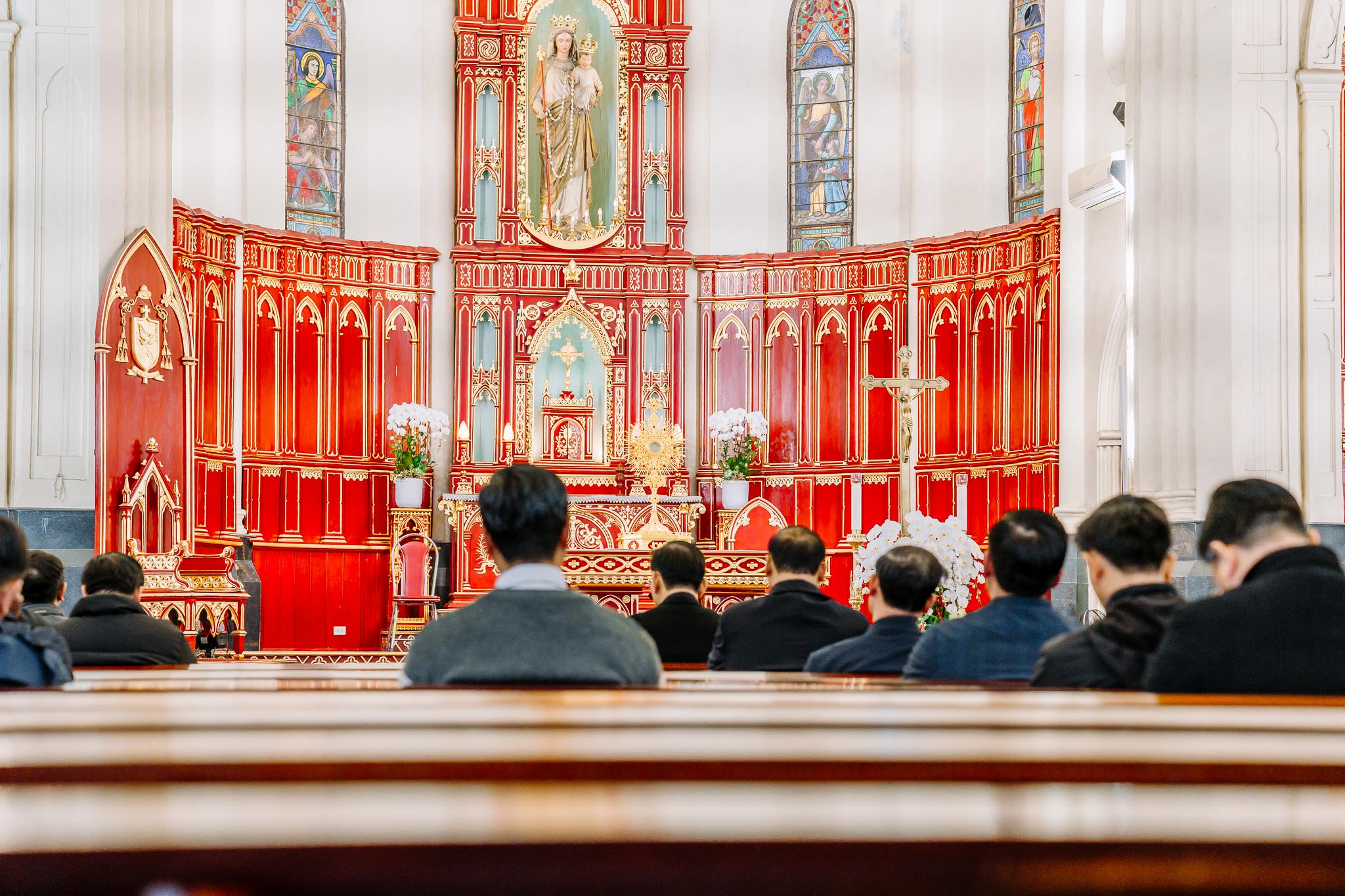 Giờ họp kết thúc lúc 9h30, cộng đoàn hiện diện đã cùng bước vào giờ Chầu Thánh Thể sốt sắng tại Nhà thờ Chính Tòa. Giờ chầu có sự hiện diện quý báu của Đức Cha Vinh Sơn. Trong bầu khí linh thiêng, quý Cha cũng dành thời gian tĩnh tâm, xét mình và lãnh nhận Bí tích Hòa giải để khởi đầu năm mới trong ân sủng và bình an của Thiên Chúa.