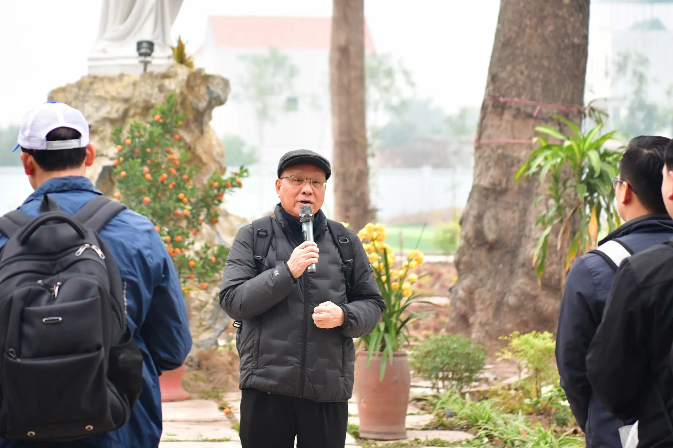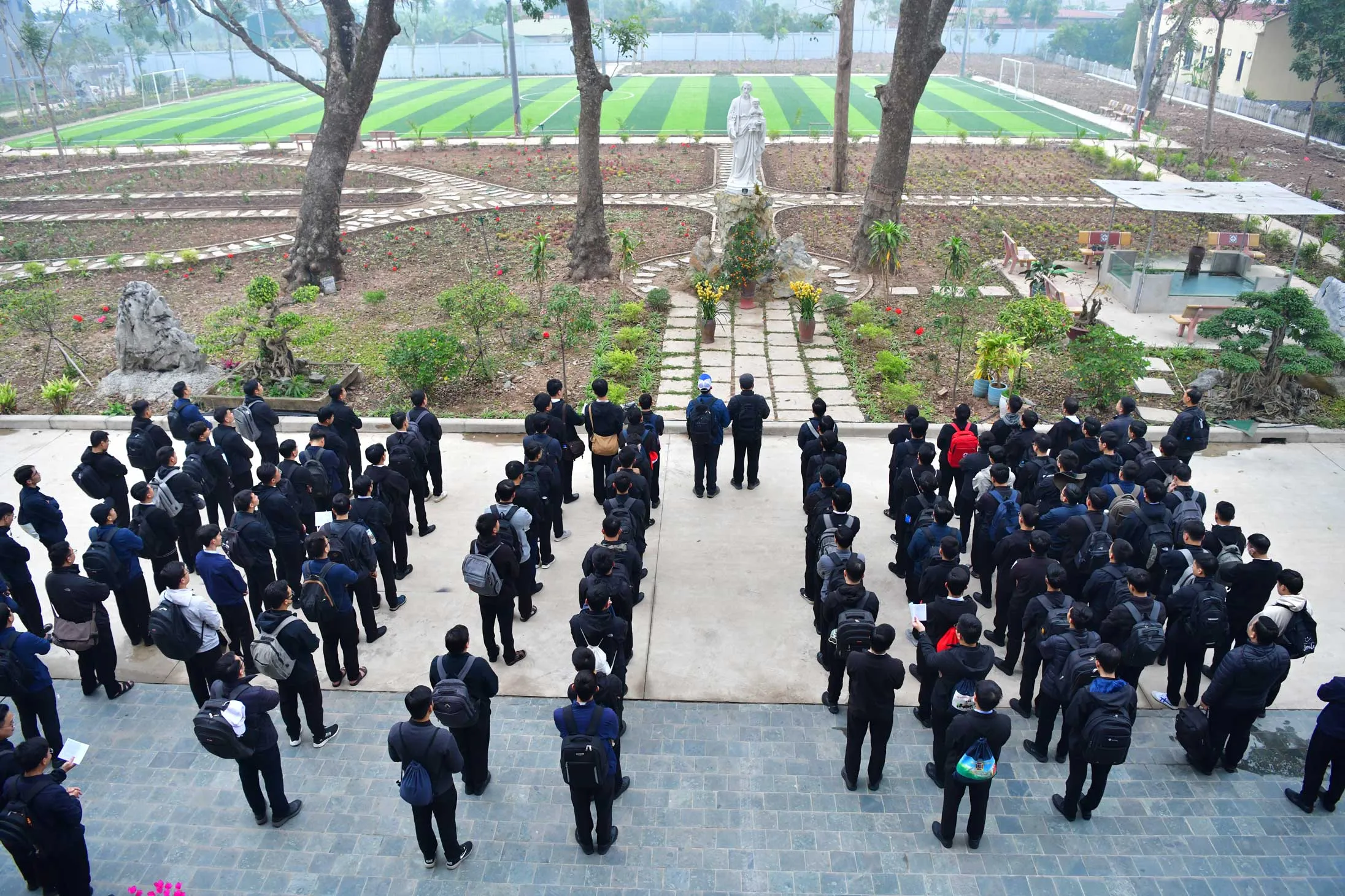 Đúng 7h00, quý thầy tập trung trước tượng đài thánh Giu-se để cầu xin cho chuyến hành hương được diễn ra tốt đẹp. Đồng hành cùng đoàn có Cha Phó Giám đốc Giu-se Nguyễn Văn Diễm, quý cha, quý sơ và bà con Giáo xứ Hoàng Nguyên.