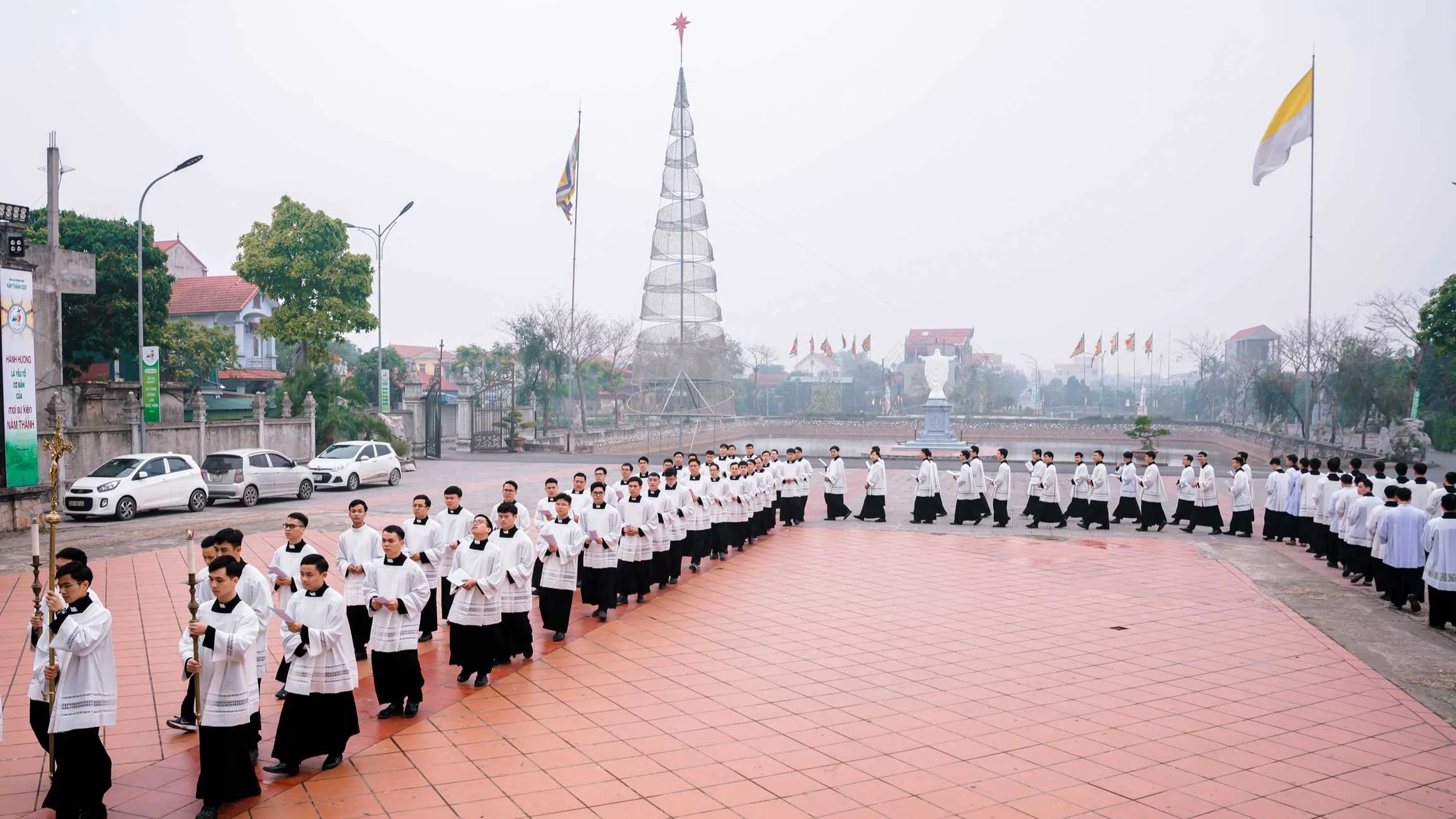 Trước đó, Cha Phó Giám đốc nhắn nhủ với quý thầy: tất cả chúng ta là những người lữ hành trên trần gian này. Chúng ta hành hương để tiến về Nhà Cha trên trời, là đích điểm của cuộc đời. Khi hành hương, quý thầy có thể đọc kinh và cầu nguyện cho các giáo xứ mà chúng ta đi qua.