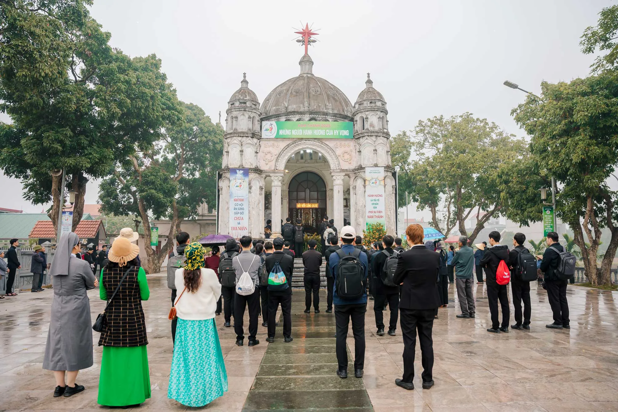 Điểm đến đầu tiên là Đền thánh Giu-se. Nơi đây, đoàn hành hương được lắng nghe Cha An-tôn Nguyễn Văn Đồng – Phó xứ Bút Đông, chia sẻ về mảnh đất linh thiêng gắn liền với gương mẫu của Thánh cả Giu-se. Với lời kinh, những phút cầu nguyện lặng thầm, mỗi người nhớ lại những ân thiêng được thánh Giu-se trao ban, từ đó noi gương ngài, đặt mọi hy vọng nơi Chúa.
