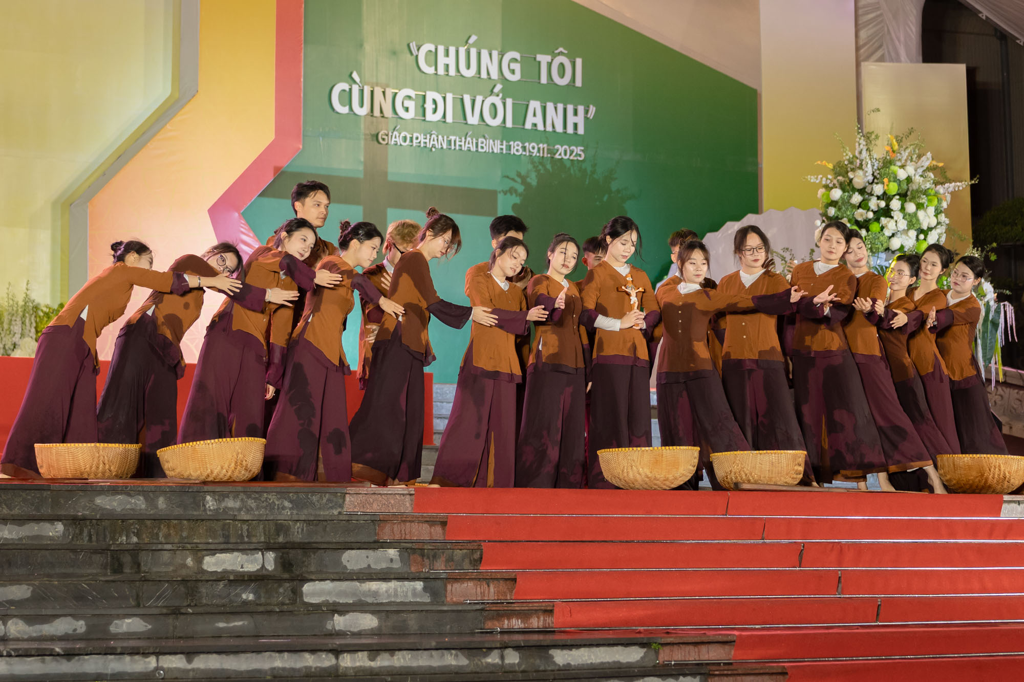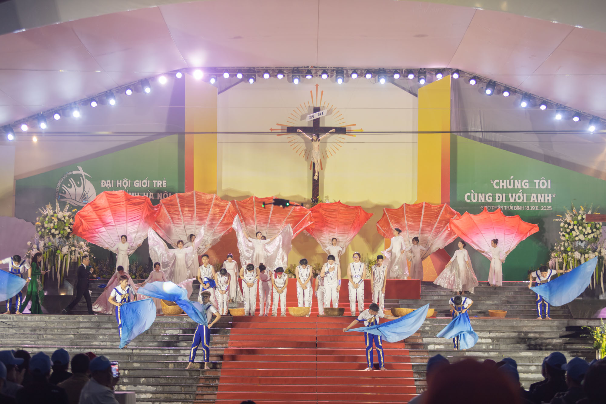 Từ lúc 18h30, chương trình Diễn nguyện được khởi động với các tiết mục văn nghệ và hoạt cảnh được dàn dựng công phu do đại diện các Giáo phận thực hiện. Qua lời ca, vũ điệu và những câu chuyện trong Tin Mừng được chuyển tải bằng ngôn ngữ nghệ thuật, các bạn trẻ được dẫn bước vào hành trình suy tư về ơn gọi, sự hiệp nhất và vai trò sống đức tin giữa xã hội hôm nay.