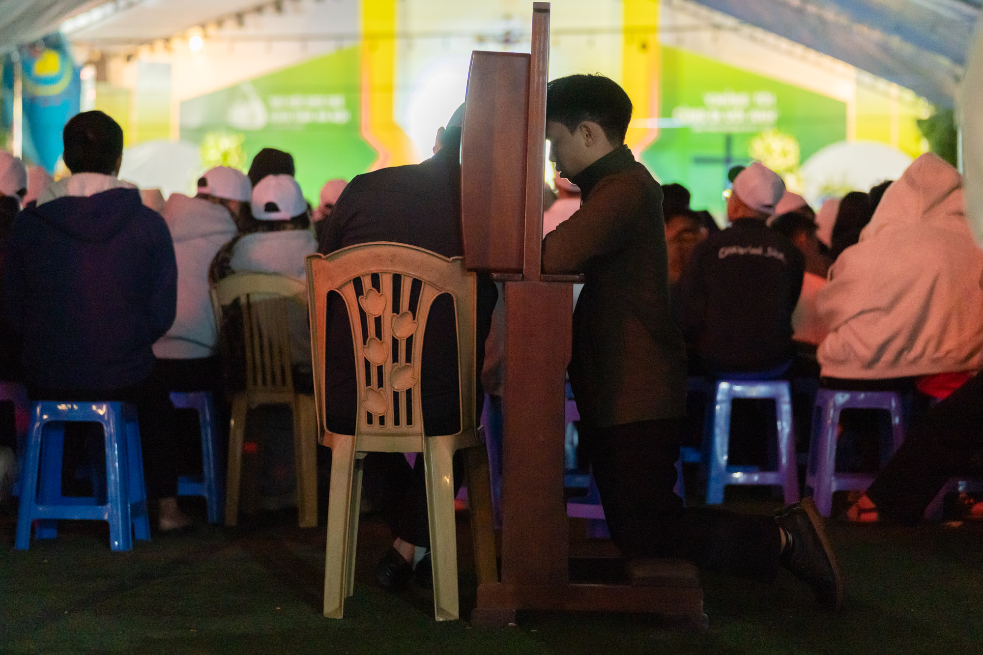 Lúc 21h00, toàn thể Đại hội bước vào giờ Chầu Thánh Thể, trọng tâm thiêng liêng của buổi tối. Trong thinh lặng , các bạn trẻ cùng nhau thờ lạy, chiêm ngắm và tâm sự với Chúa Giêsu Thánh Thể. Những phút giây lắng đọng đã chạm đến chiều sâu tâm hồn, giúp mỗi bạn trẻ gặp lại chính mình và kín múc nguồn sức mạnh nội tâm cho hành trình đức tin.