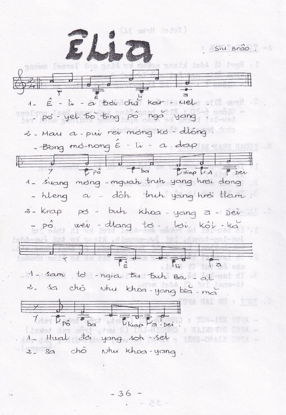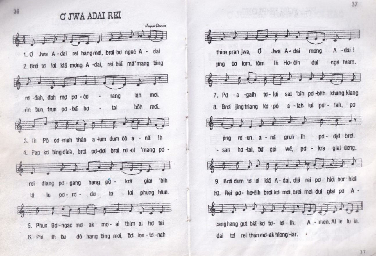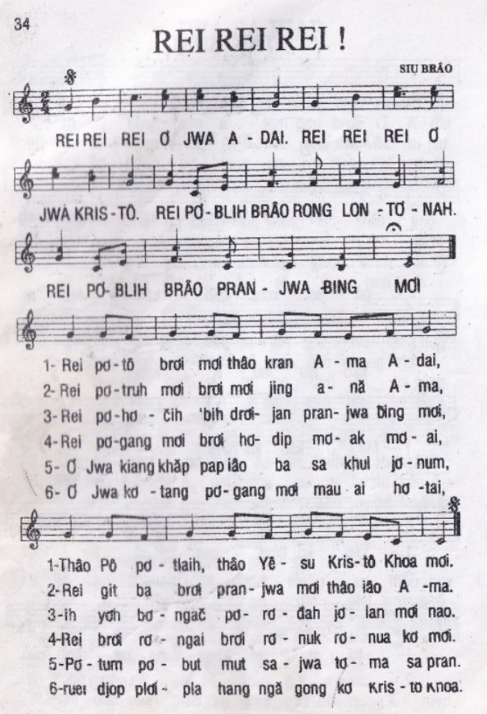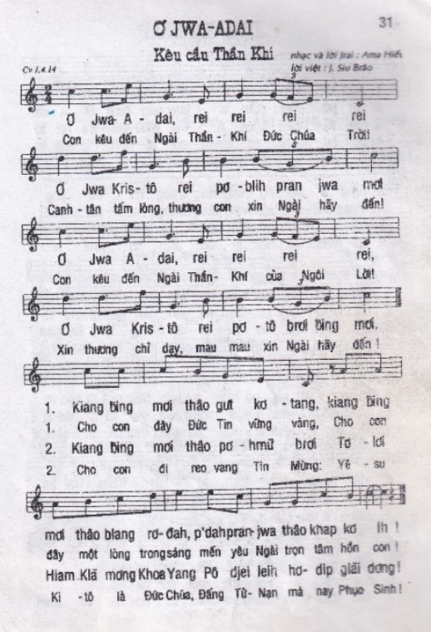Theo lời kể của Cha Tín (Siu Brâo)[11], bài thánh ca đầu tiên mà ngài dịch qua tiếng Jrai là bài Trông đợi, nhạc của Didier Rimaud, lời Việt của Cha Giuse Phạm Đán Bình, DCCT. Ngài chia sẻ: “Kể từ khi bắt đầu có người Jrai tham dự Thánh Lễ, lúc ấy chỉ có bọn trẻ vào khoảng năm 1973, tôi đã dịch bài này qua tiếng Jrai. Đến Giáng Sinh, người Jrai cần bài Giáng Sinh thì tôi dịch bài Hang Belem của Hải Linh.”[12] Tuy nhiên, ngài cũng nhấn mạnh: tôi “chuyển ngữ” chứ không phải “chuyển dịch” vì tôi đã đưa pơtưh (câu nói vần) của người Jrai vào bài hát. Đến khoảng năm 1988, khi người Jrai ồ ạt theo Đạo, thì Cha Tín sáng tác bài đầu tiên bao gồm cả nhạc và lời, đó là bài Rei Rei Rei! Ngài chia sẻ về bài thánh ca này như sau: “Xin Thần Khí đến dạy cho chúng con biết kêu Ama (Chúa Cha), kết nghĩa cho chúng con được làm con Ama (Chúa Cha), nghĩa là giao ước đấy!” Sau này, khi cần phải dịch ra tiếng Việt, Cha Tín mới dịch bài này ra tiếng Việt và có tên là Lạy Thần Khí.