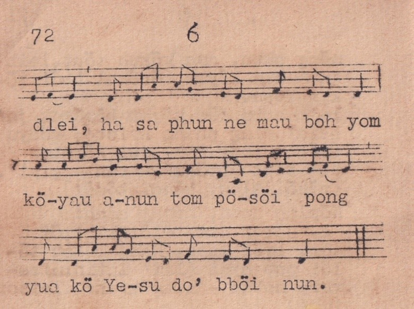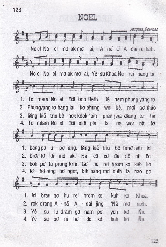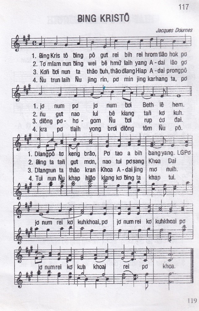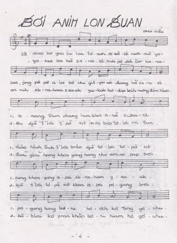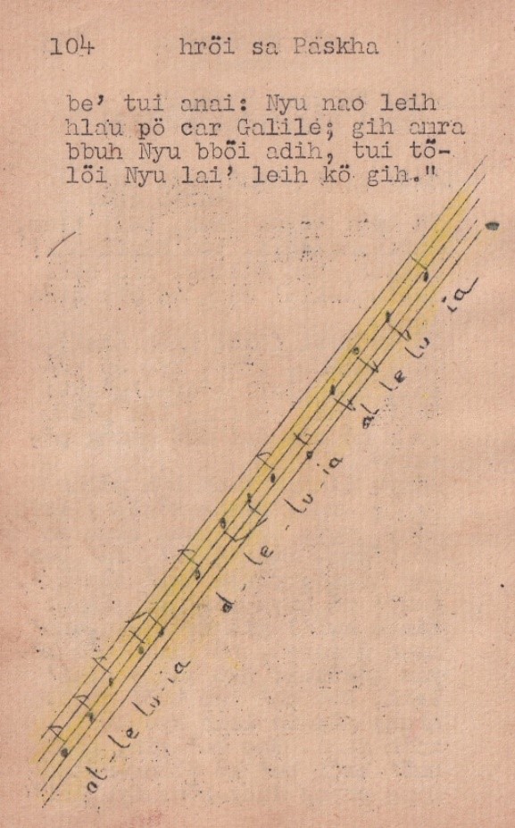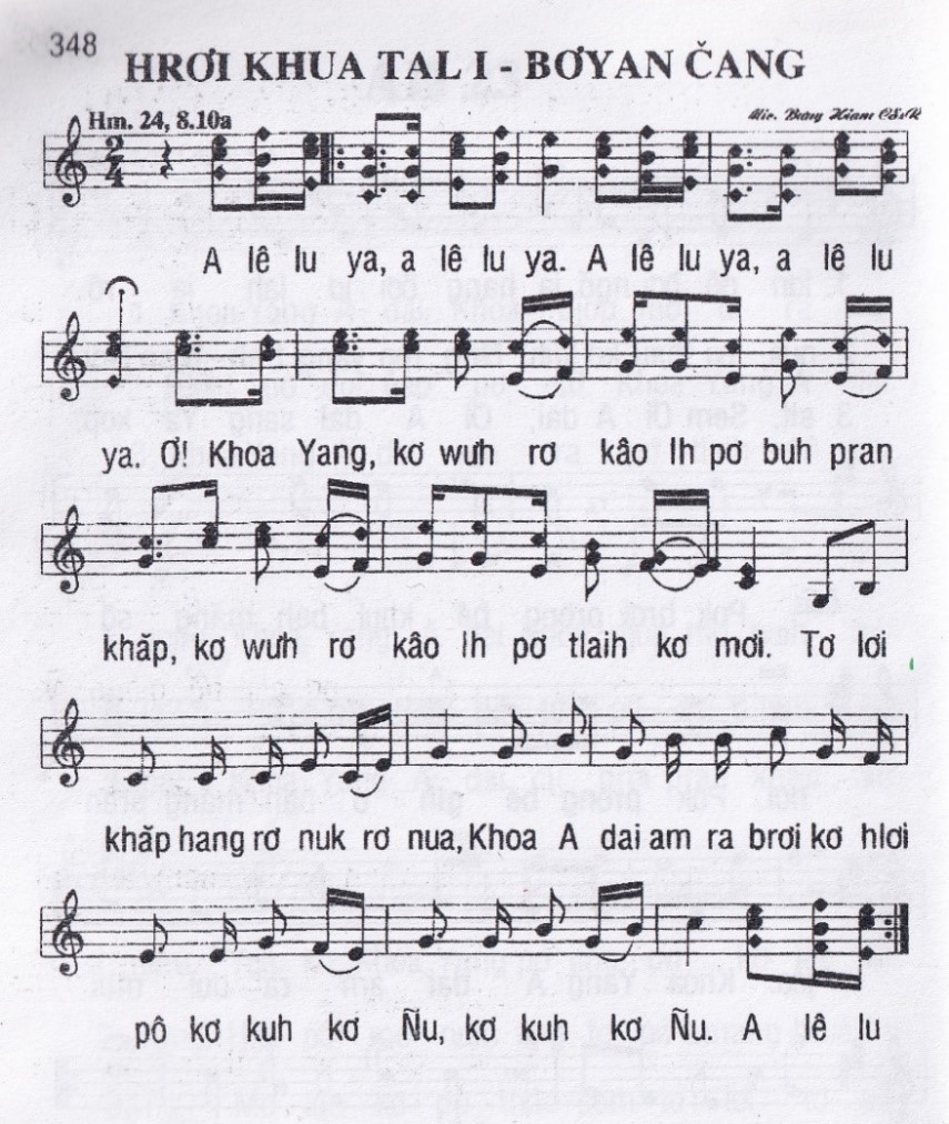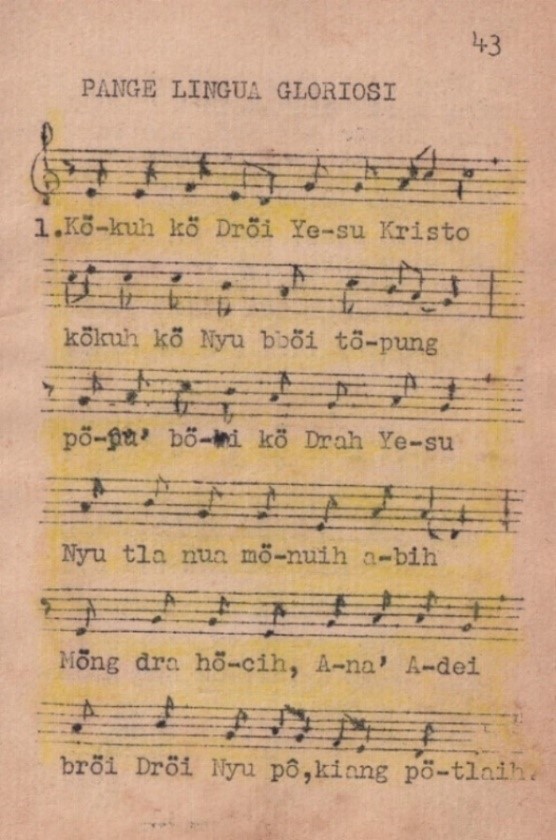 Trở lại với lịch sử truyền giáo cho người Jrai, cho dù Đức cha Cuénot Thể đã sớm thành lập Trung tâm truyền giáo cho người Jrai từ năm 1851 nhưng kết quả không mấy khả quan. Việc tái khởi động việc truyền giáo cho người Jrai được Đức cha Paul Seitz (Kim) thực hiện bằng việc trao cho Cha Jacques Dournes (1922-1993) vùng Cheoreo – Tơlúi[7] vào năm 1955. Đứng trước nhu cầu thực tế qua phụng vụ Thánh Lễ, hiện tại chúng tôi lưu trữ được một cuốn sách nhỏ với tiêu đề “Paskha”, đã được Cha Jacques Dournes biên soạn bằng tiếng Jrai xuất bản vào tháng 09/1959. “Paskha” là cuốn sách hướng dẫn phụng vụ tuần thánh bắt đầu từ Lễ Lá cho đến Chúa nhật Phục Sinh. Trong cuốn sách này, Cha Jacques Dournes đã chuyển ngữ bài Panga Lingua Gloriosi[8] qua tiếng Jrai. Ngoài ra còn có những câu xướng – đáp trong việc Suy tôn Thánh giá thứ sáu tuần thánh[9], câu Alleluia trong đêm vọng phục sinh và Chúa nhật Phục Sinh.