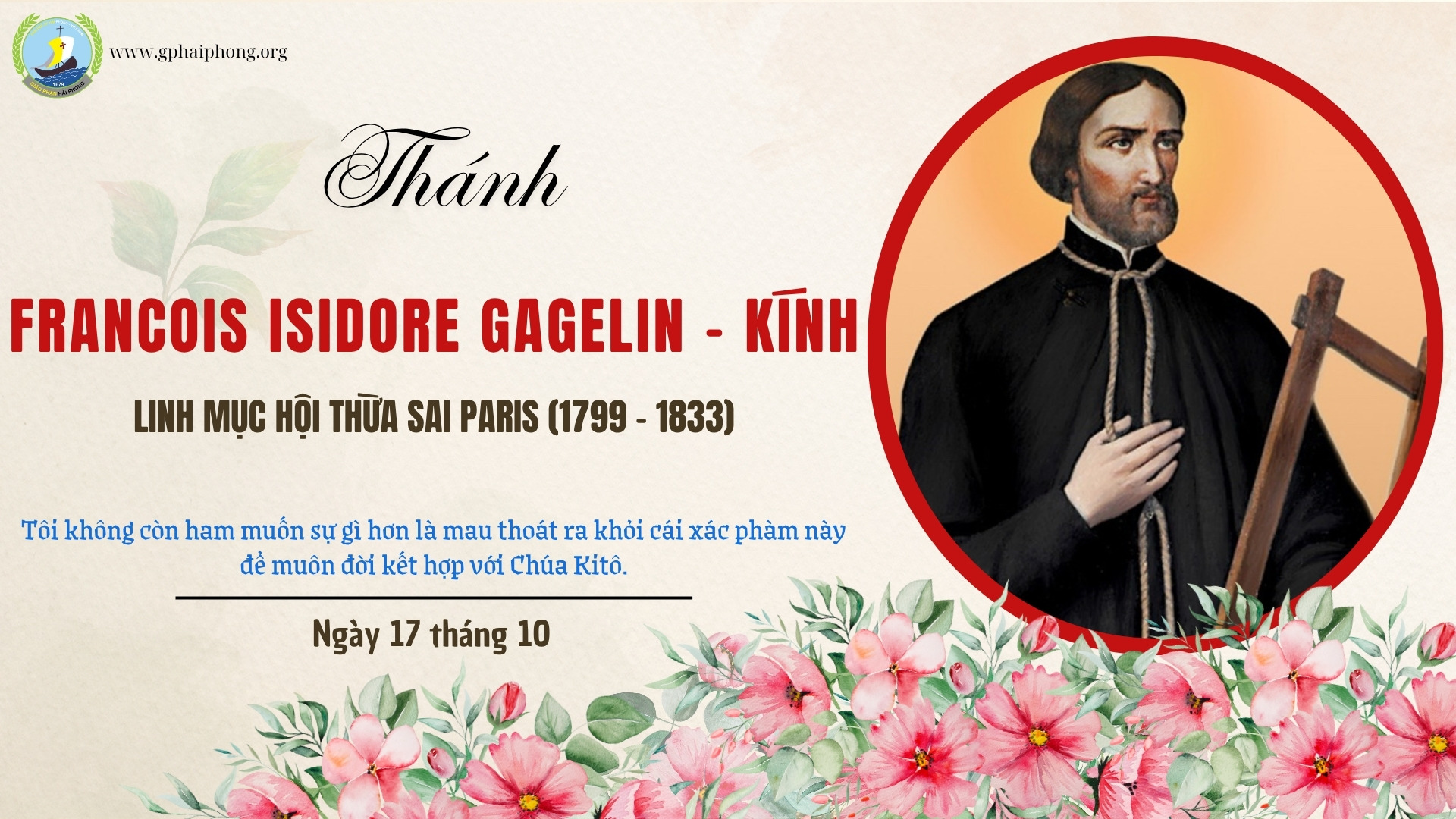 Thánh François Isidore Gagelin - Kính sinh ngày 10-5-1799 tại làng Montperreux, thuộc Giáo phận Besançon, nước Pháp. Khi lên hai tuổi, Isidore mồ côi cha. Cậu là một học sinh thông minh và gương mẫu.