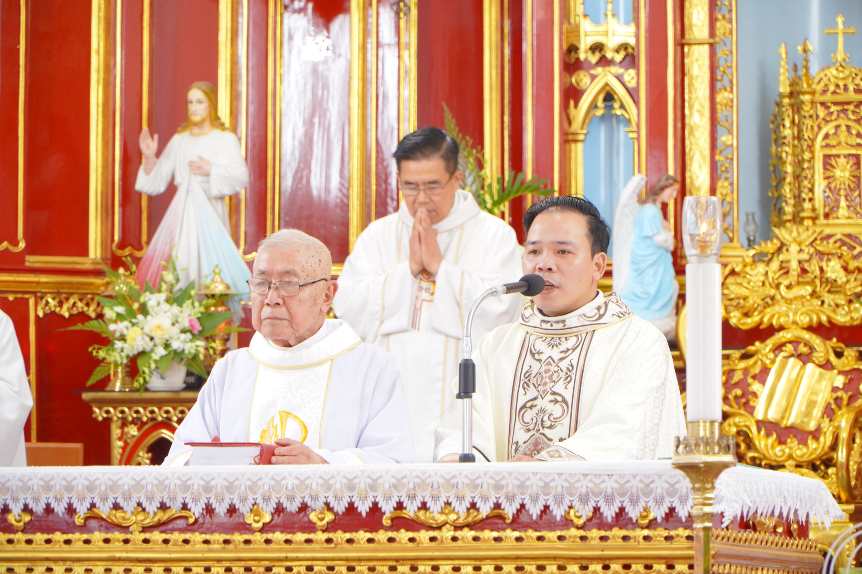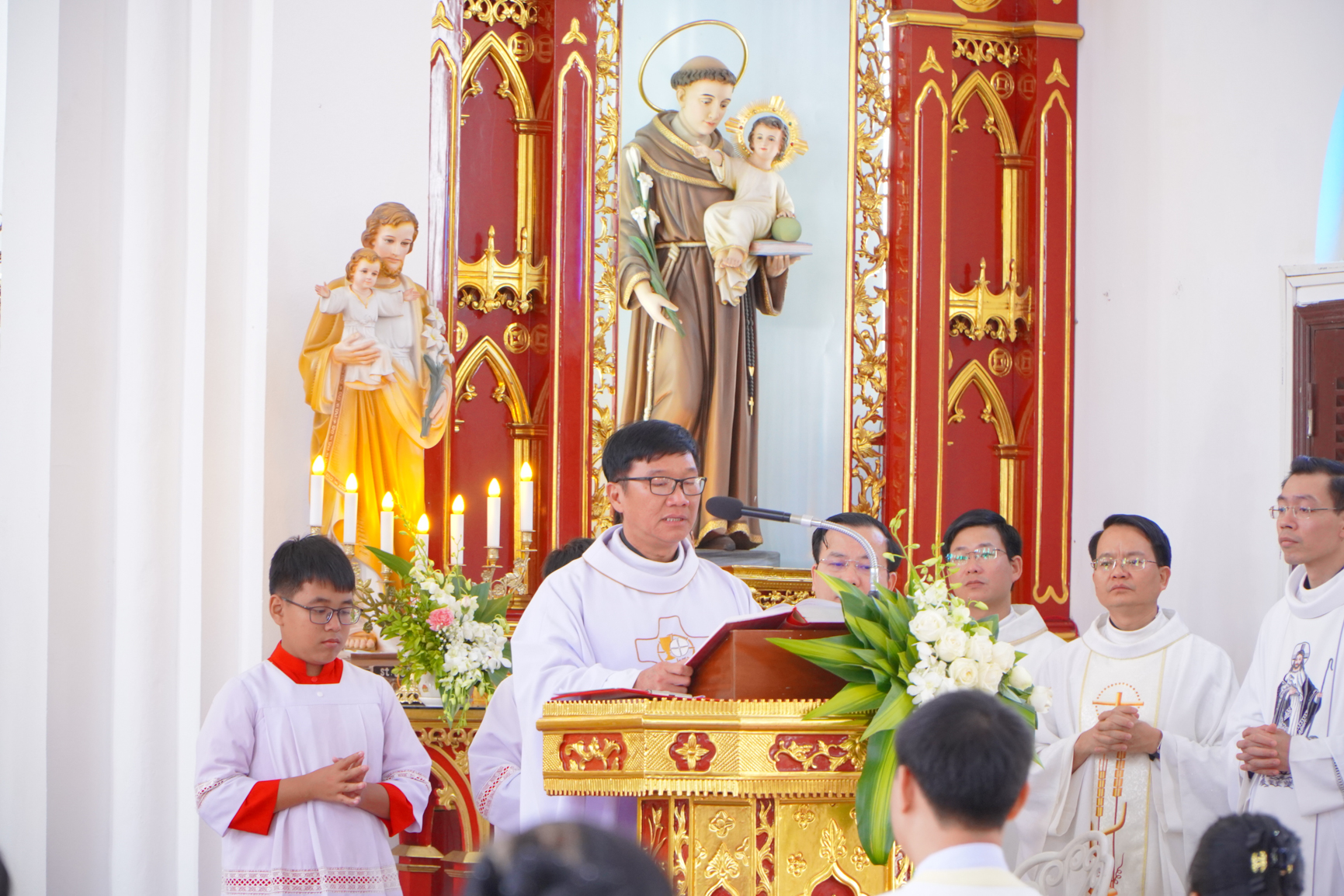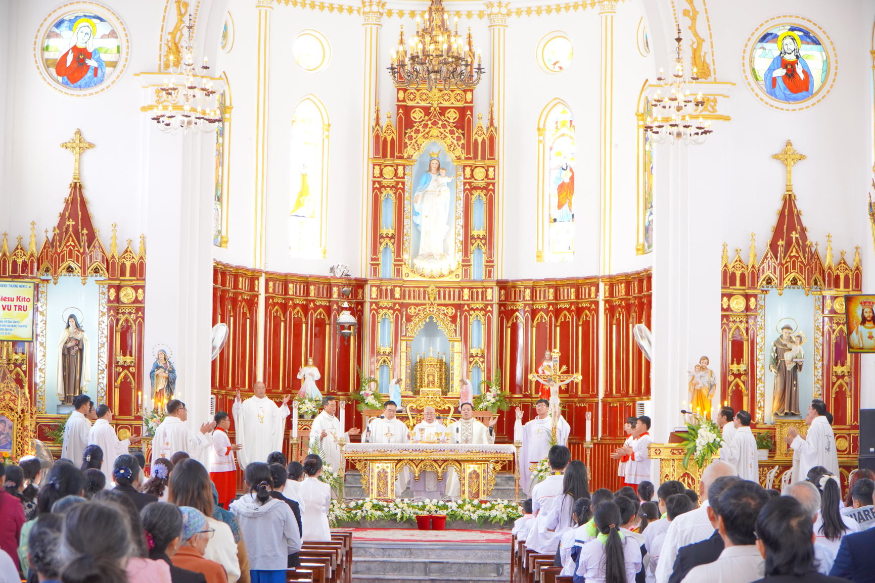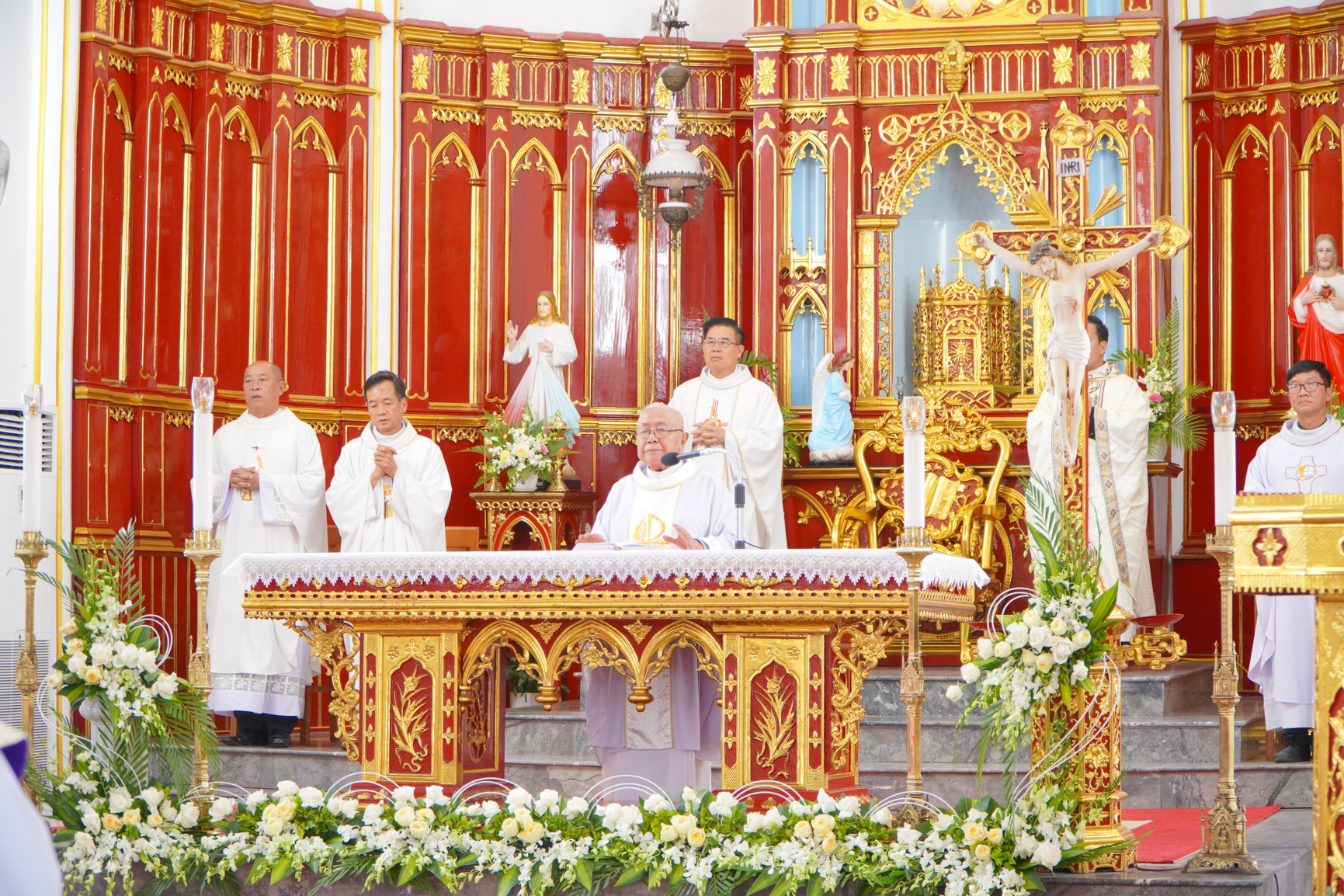Thánh lễ đồng tế được cử hành trọng thể với sự hiện diện của Cha cố Antôn Nguyễn Văn Uy – chủ sự Thánh lễ, Cha Quản hạt Inhaxiô Đoàn Thanh Vững; quý Cha trong Giáo hạt Chính Toà cùng đông đảo cộng đoàn Dân Chúa trong và ngoài giáo xứ.