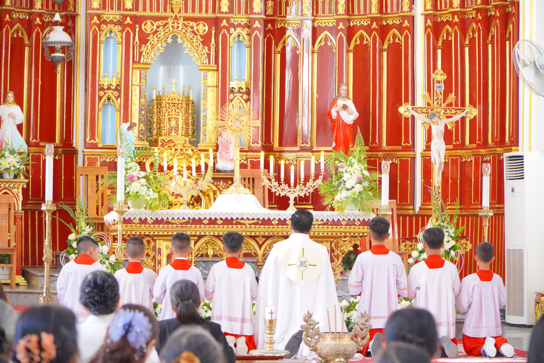 Trước khi bắt đầu Thánh lễ Tạ ơn, cha xứ Gioan Baotixita Đinh Văn Huynh cùng cộng đoàn tạ ơn Chúa trong giờ Chầu tạ với bầu khi trang nghiêm và sốt sắng.