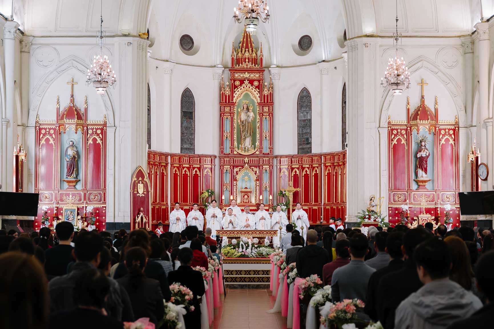 Thánh lễ do Đức cha Giáo phận chủ sự. Đồng tế với Đức cha có Cha xứ Phêrô Nguyễn Văn Nguyên, Cha phụ tá Giuse Nguyễn Văn Quỳnh, quý Cha tại Tòa Giám mục, cùng sự hiện diện đông đảo của quý thầy, quý sơ và cộng đoàn Dân Chúa.