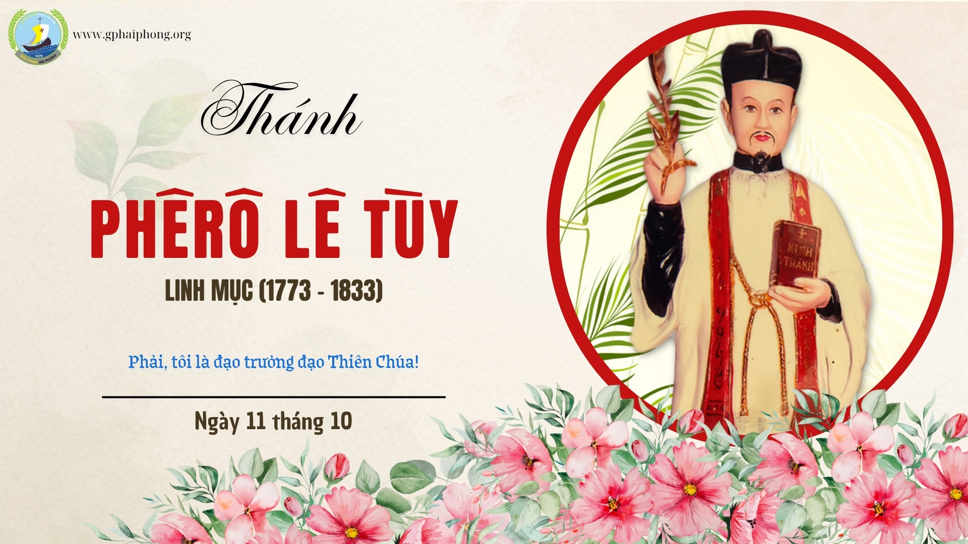 Thánh Phêrô Lê Tùy sinh năm 1773 trong một gia đình trung nông tại làng Bằng Sở, thuộc xứ đạo Sở Hạ, nay thuộc huyện Thanh Trì, Hà Nội. Chú Tùy được nhập chủng viện Kẻ Vĩnh, tỉnh Nam Định, sau đó được phong linh mục. Cha Tùy hăng say làm phó xứ Đông Thành (Chân Lộc) rồi chánh xứ Nam Đường tỉnh Nghệ An.