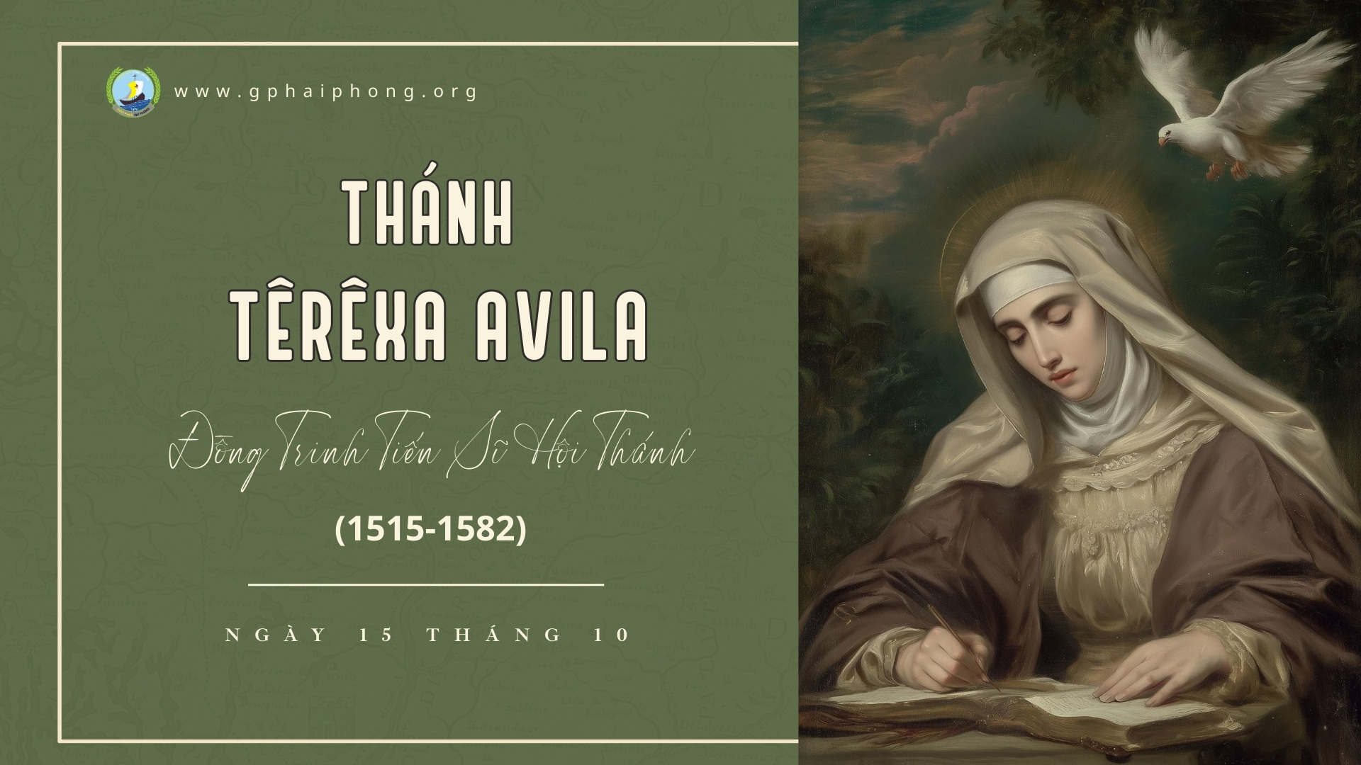 Thánh nữ Têrêxa sinh ngày 18/3/1515 tại Avila nước Tây Ban Nha, trong một gia đình quý phái. Sống giữa bầu khí đạo hạnh nên ngài sớm trưởng thành trên đường nhân đức. Ngài thích đọc sách các thánh tử đạo và các sách viết về cuộc khổ nạn của Chúa Giêsu. Tuy bị gia đình ngăn cản, năm 1535, ngài đã can tâm gạt bỏ tất cả để vào dòng Carmêlô, lúc đó được 20 tuổi. Ngài đã góp công rất nhiều trong việc cải tổ dòng này và đã để lại nhiều tư tưởng thần học giá trị. Ngài có lòng kính mến Ðức Mẹ cách đặc biệt. Với tinh thần nhiệm nhặt, ngài lập một tu viện mới ở Avila và tiếp tục xây thêm nhiều nhà khác nữa. Ngài dâng mọi đau khổ tinh thần cũng như thể xác để cầu cho những người tội lỗi. Tuy bận rộn với công việc nhà dòng, ngài vẫn dành nhiều thời giờ để ghi lại những tư tưởng thiêng liêng, suy gẫm và phổ biến việc giữ luật dòng Carmêlô cho các tín hữu nam nữ (1562-1568). Ngài dâng các việc hãm mình hy sinh và đánh tội trong suốt cả đời để cầu nguyện cho anh em ly giáo và lạc giáo. Với một lòng tin tưởng sâu xa, ngài luôn nói: "Lạy Chúa, dù thành công hay thất bại, con vẫn một lòng tin tưởng vào Chúa".