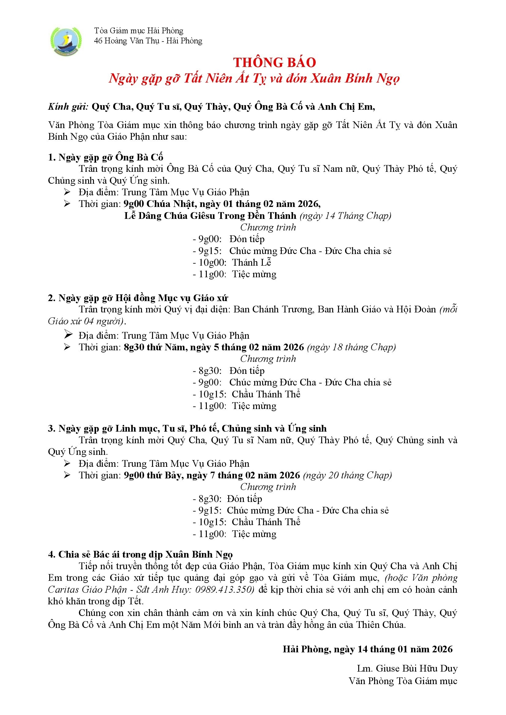 Kính gửi: Quý Cha, Quý Tu sĩ, Quý Thày, Quý Ông Bà Cố và Anh Chị Em, Văn Phòng Tòa Giám mục xin thông báo chương trình ngày gặp gỡ Tất Niên Ất Tỵ và đón Xuân Bính Ngọ của Giáo Phận như sau
