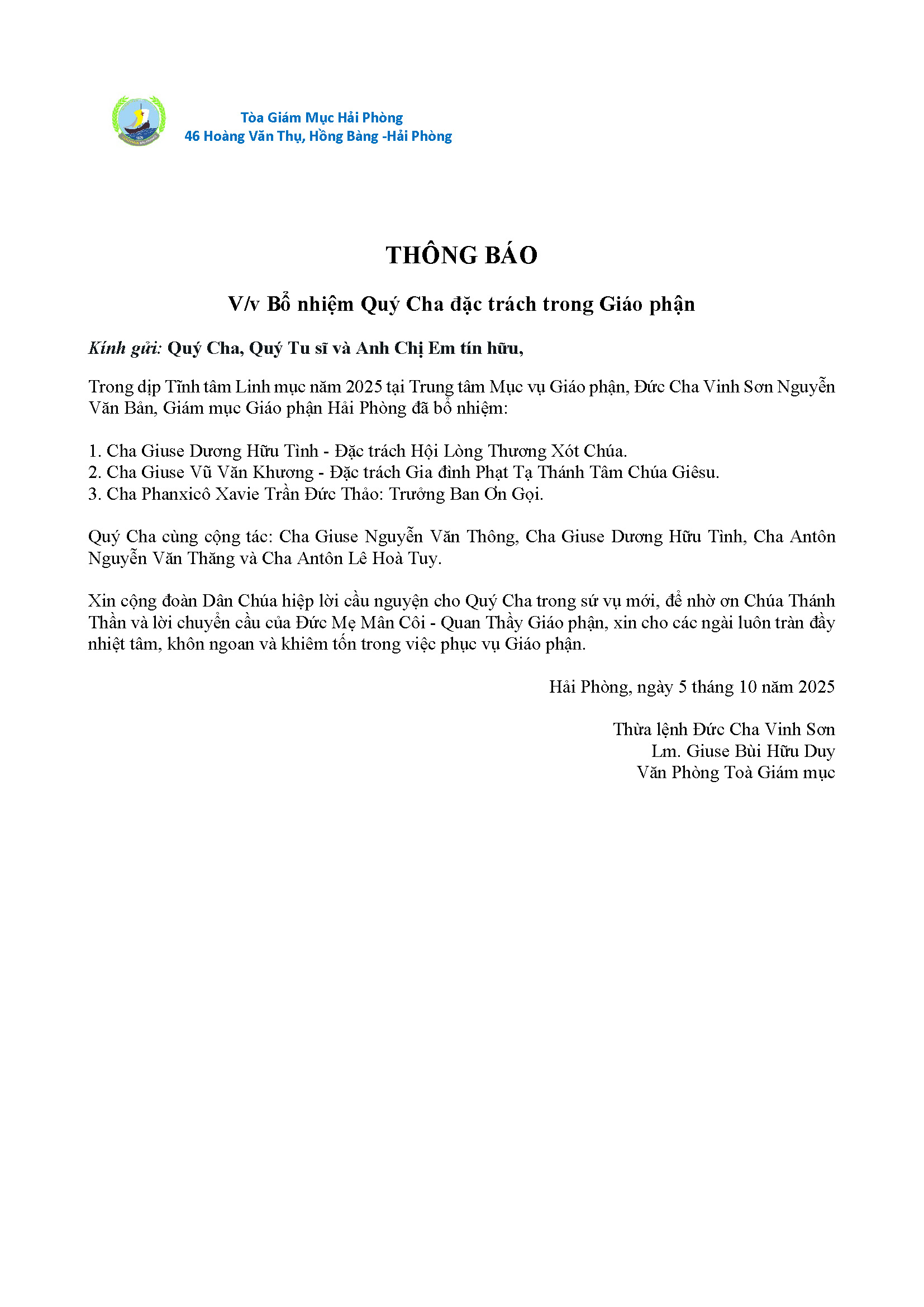 Thông báo: Về việc bổ nhiệm Quý Cha đặc trách trong Giáo phận