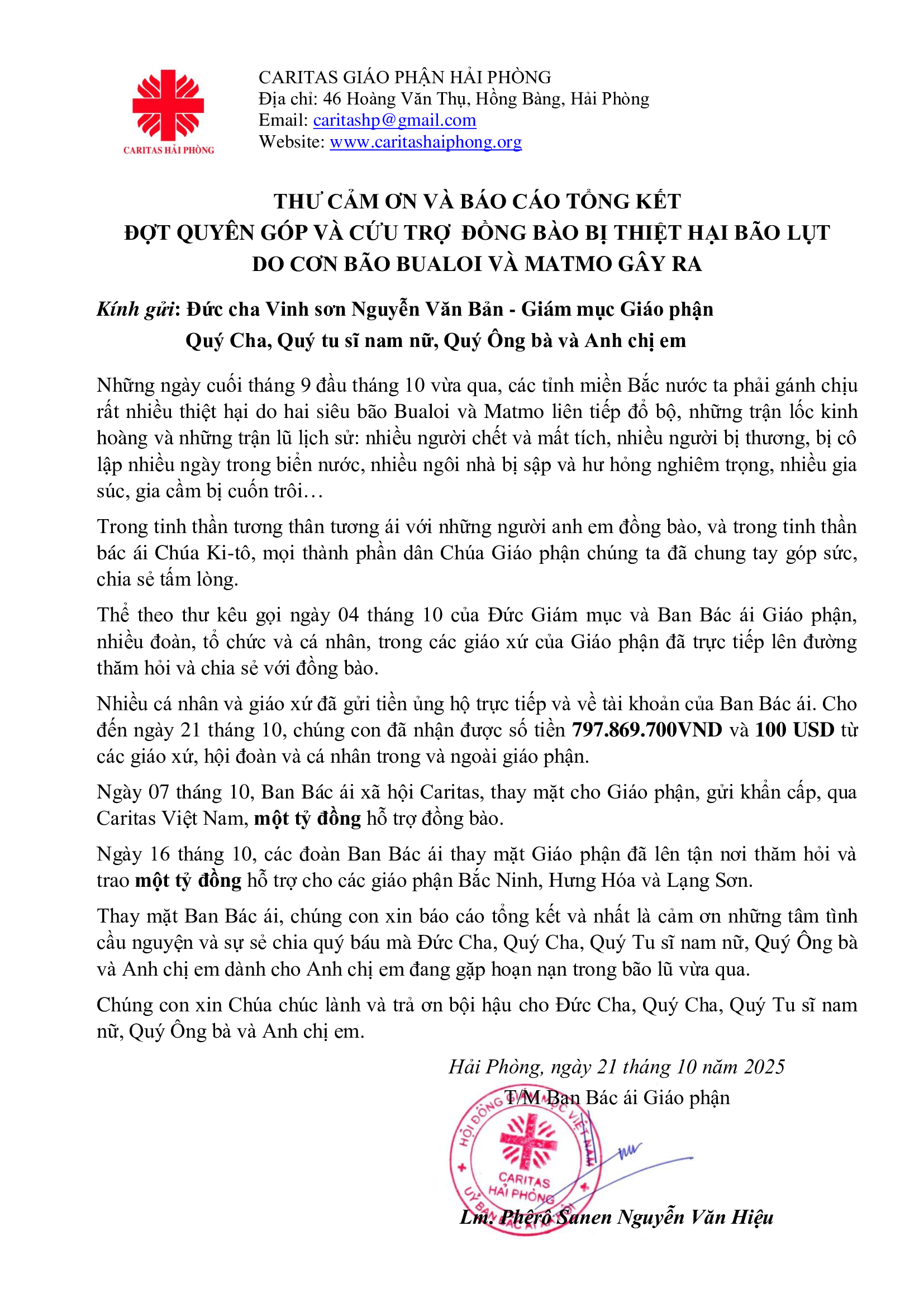 Thay mặt Ban Bác ái, chúng con xin báo cáo tổng kết và nhất là cảm ơn những tâm tình cầu nguyện và sự sẻ chia quý báu mà Đức Cha, Quý Cha, Quý Tu sĩ nam nữ, Quý Ông bà và Anh chị em dành cho Anh chị em đang gặp hoạn nạn trong bão lũ vừa qua.
