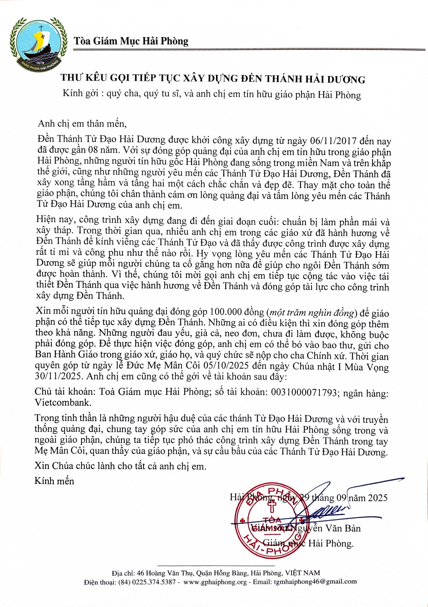 THƯ KÊU GỌI TIẾP TỤC XÂY DỰNG ĐỀN THÁNH HẢI DƯƠNG