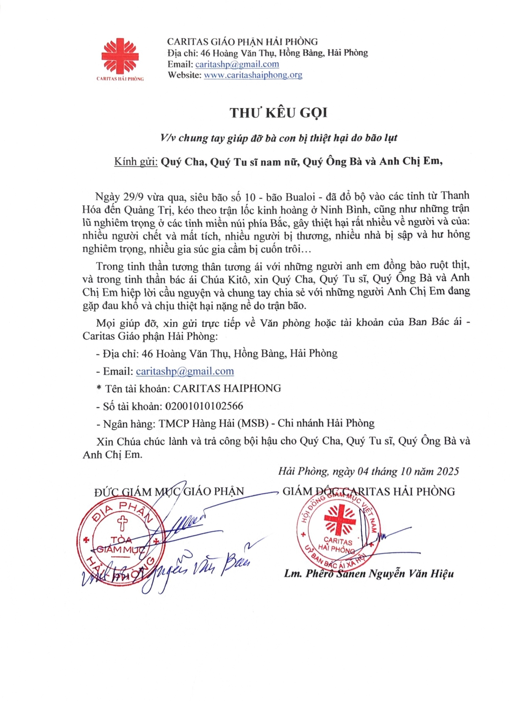 Trong tinh thần tương thân tương ái với những người anh em đồng bào ruột thịt, và trong tinh thần bác ái Chúa Kitô, xin Quý Cha, Quý Tu sĩ, Quý Ông Bà và Anh Chị Em hiệp lời cầu nguyện và chung tay chia sẻ với những người Anh Chị Em đang gặp đau khổ và chịu thiệt hại nặng nề do trận bão.