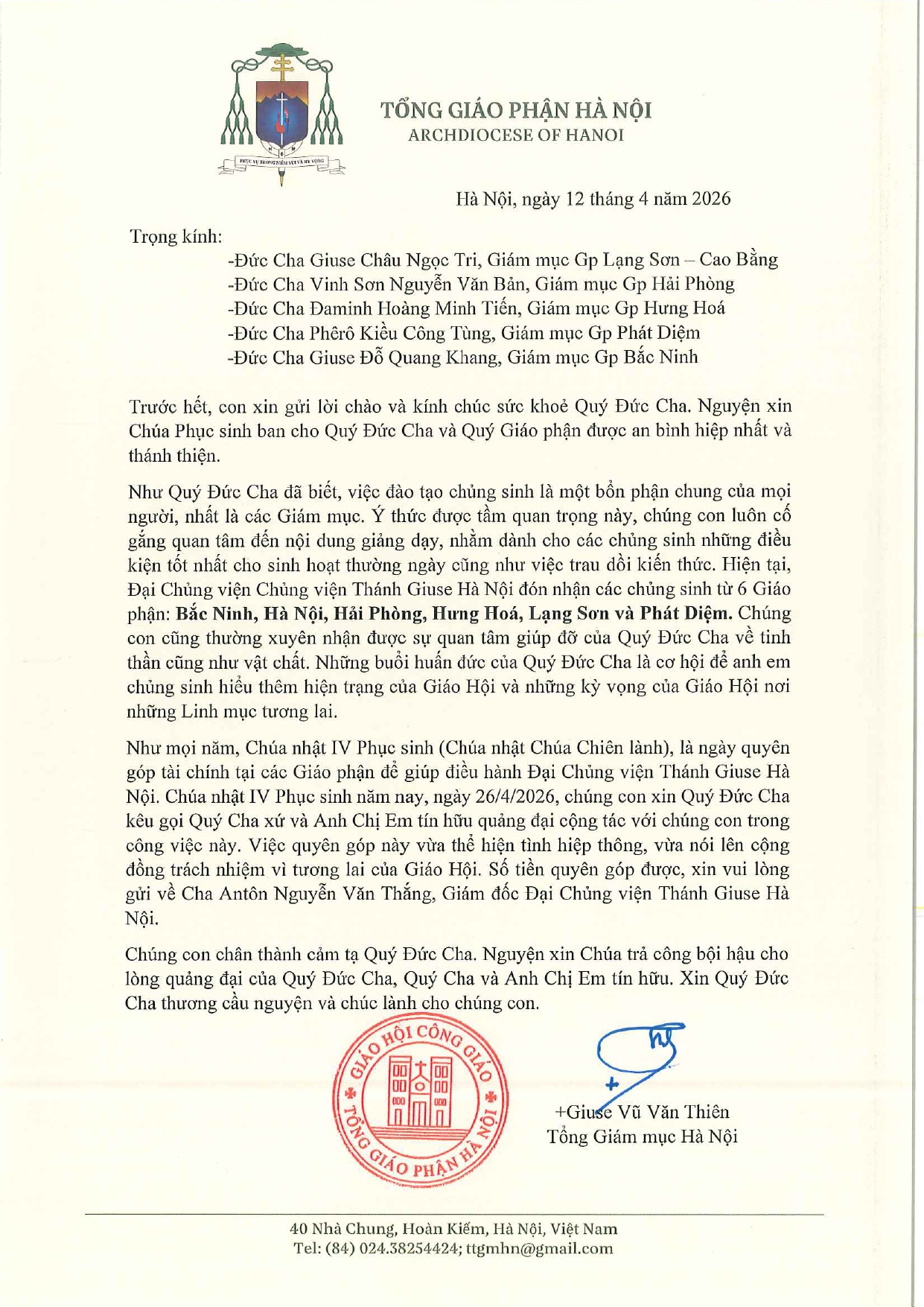 Thư Quyên góp cho Đại Chủng viện Thánh Giuse Hà Nội