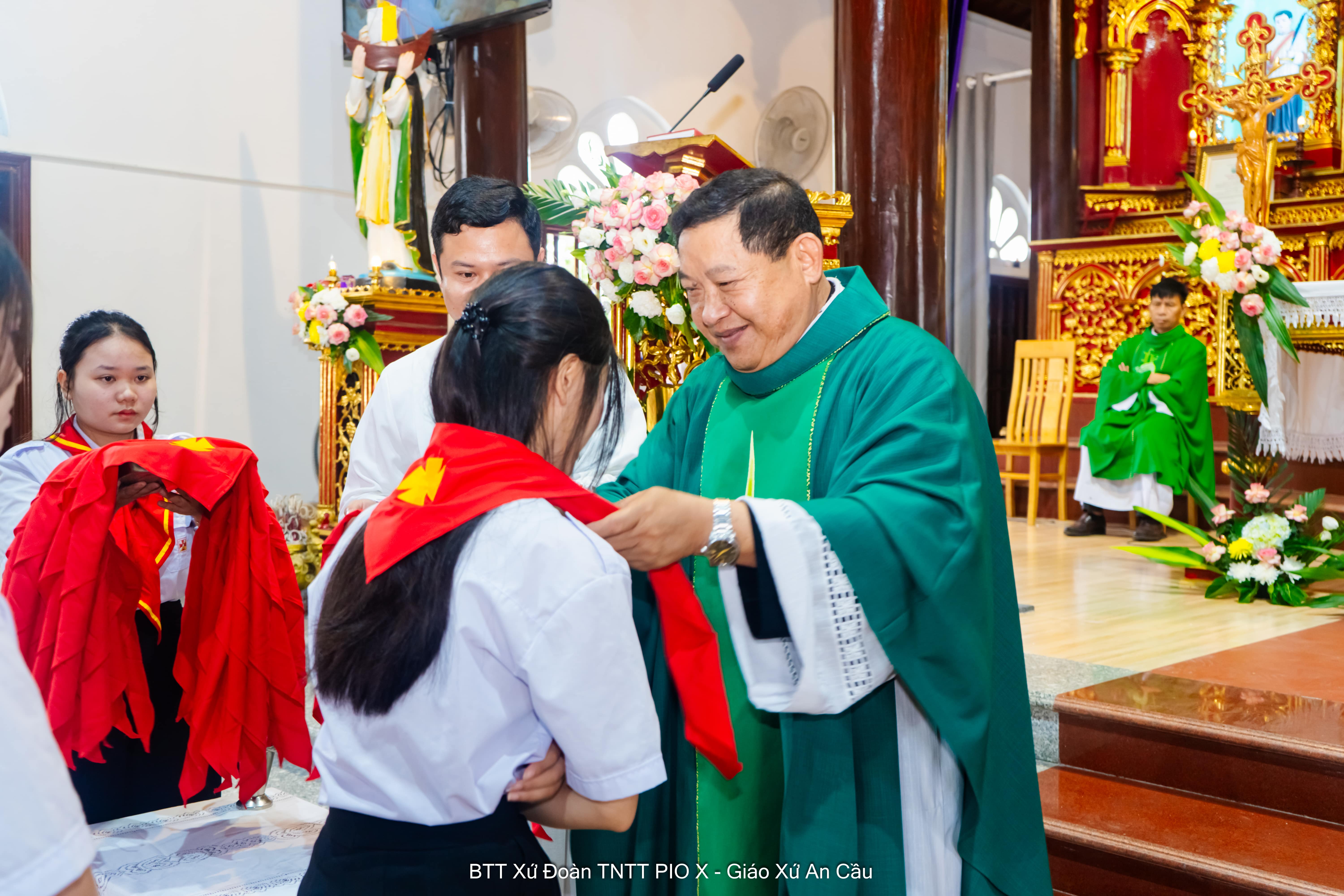 Trong Thánh lễ có nghi thức nâng khăn và tuyên hứa của 23 em trong xứ đoàn. Từ đây, các em chính thức bước vào vai trò mới – trở thành người bạn đồng hành, người hướng dẫn, nâng đỡ và dấn thân cùng các em nhỏ trong hành trình theo Chúa.