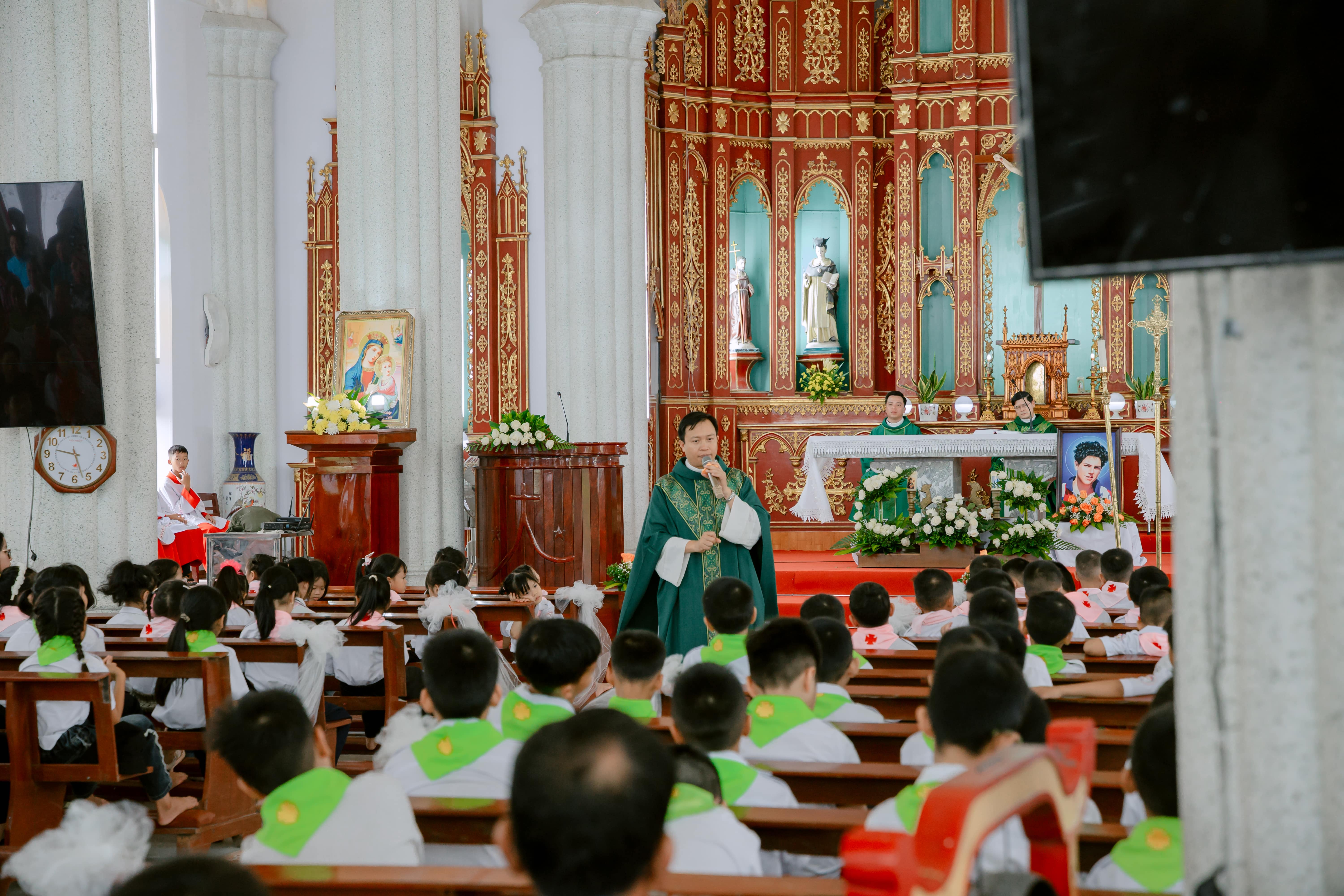 Trong bài giảng, cha Phêrô đã chia sẻ về gương sống đức tin của Thánh Carlo Acutis – vị thánh trẻ say mê công nghệ, nhưng luôn dành trọn tình yêu cho Chúa Giêsu Thánh Thể. Qua đó, cha mời gọi các bạn trẻ hãy biết sử dụng công nghệ cách khôn ngoan, tránh sa vào những đam mê vô ích; đồng thời, siêng năng cầu nguyện, học hỏi giáo lý, sống ngoan ngoãn và hòa thuận với mọi người. Qua câu nói: “Thánh Thể là con đường cao tốc dẫn tới Thiên Đàng” – Cha cũng khích lệ các bạn trẻ hãy sống thánh thiện giữa đời thường theo gương Thánh quan thầy.